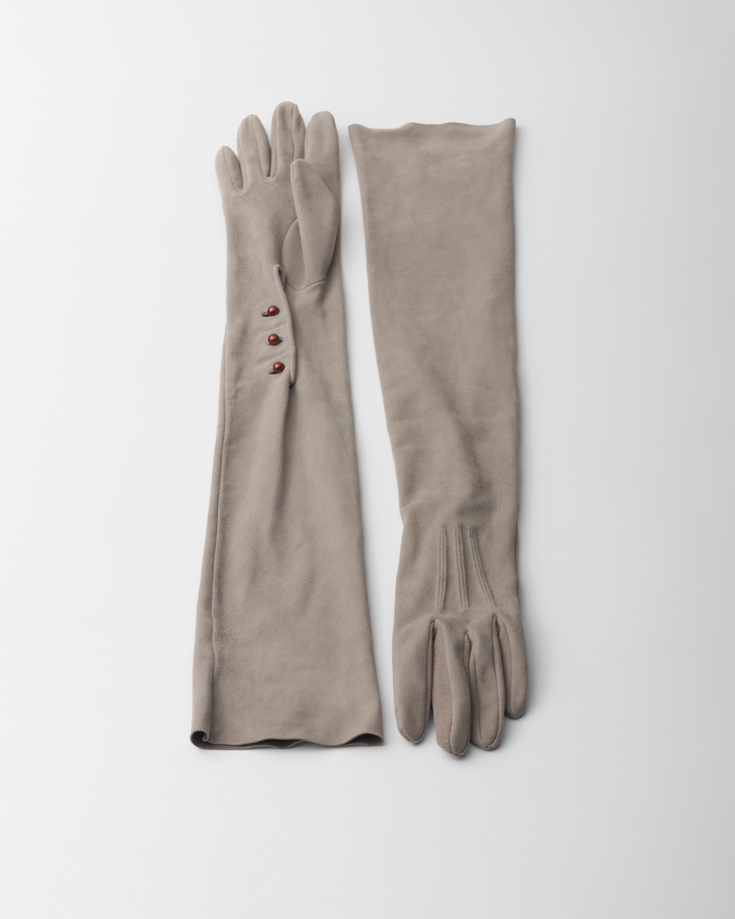 An alluring accessory with retro details, these suede gloves add a sophisticated, romantic note to every look. - Code du produit: 1GG210_15B9_F0424 - Dome button closure - Importe MATERIALS Leather