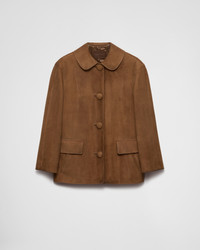 Soft, rounded lines define the silhouette of this jacket with retro charm, emphasized by the sophisticated texture of suede. - Product code: 58A202_162O_F0E2Q_S_OOO - Lined garment - Regular fit - Center button closure - Shirt-style collar - Straight sleeves - Flap pockets - Leather triangle logo on the back - Final waxing treatment - Imported - The model is 177 cm tall and wears a size 38 Height: 64cm MATERIALS Main material: Lambskin
