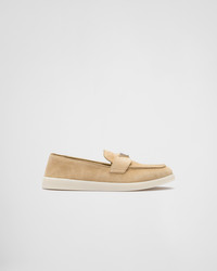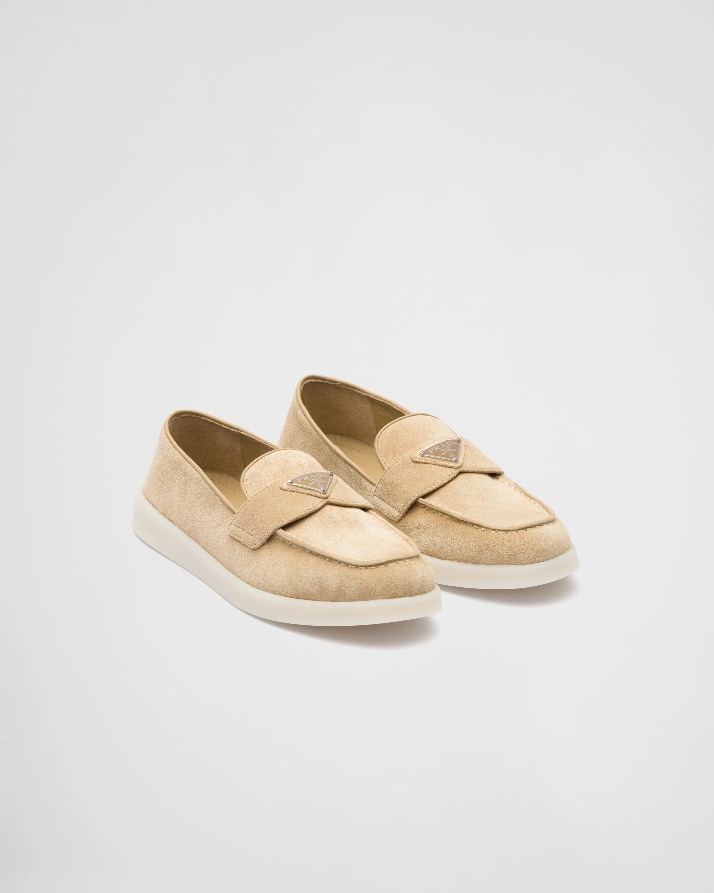These suede leather loafers express classic allure and are distinguished by the pinched stitch seam on the upper. The enameled metal triangle logo stands out on the front. - Product code: 1D222N_3LOL_F0379_F_025 - Upper with leather band - Apron with pinched stitch seam - Leather lining - Enameled metal triangle logo - 25 mm rubber sole - Removable leather-lined insole - Imported MATERIALS Leather