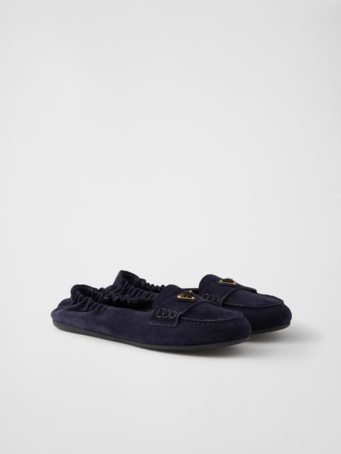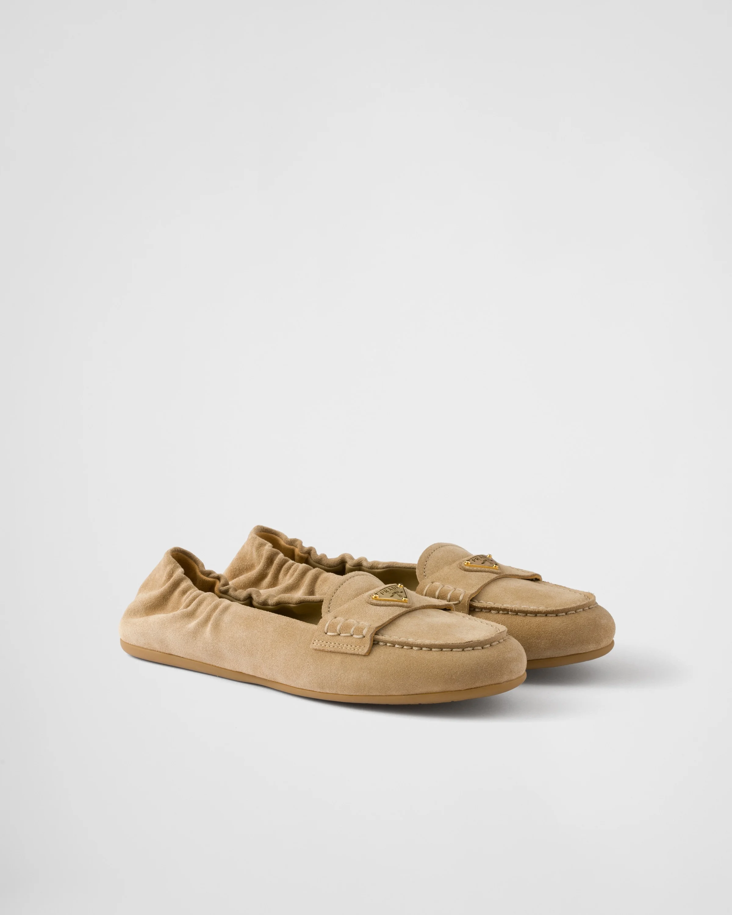 These deconstructed and flexible loafers feature classic details embellished with the emblematic enameled metal triangle logo. The soft design, completed with thin rubber soles, is emphasized by the refined touch of suede. - Product code: 1D922N_054_F0379_F_005 - Upper with leather band - Enameled metal triangle logo - Monoblock rubber sole, 5 mm, with hot-stamped logo - Imported MATERIALS Main material: Calfskin