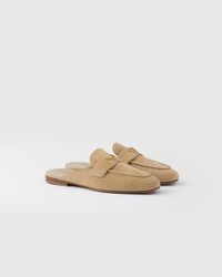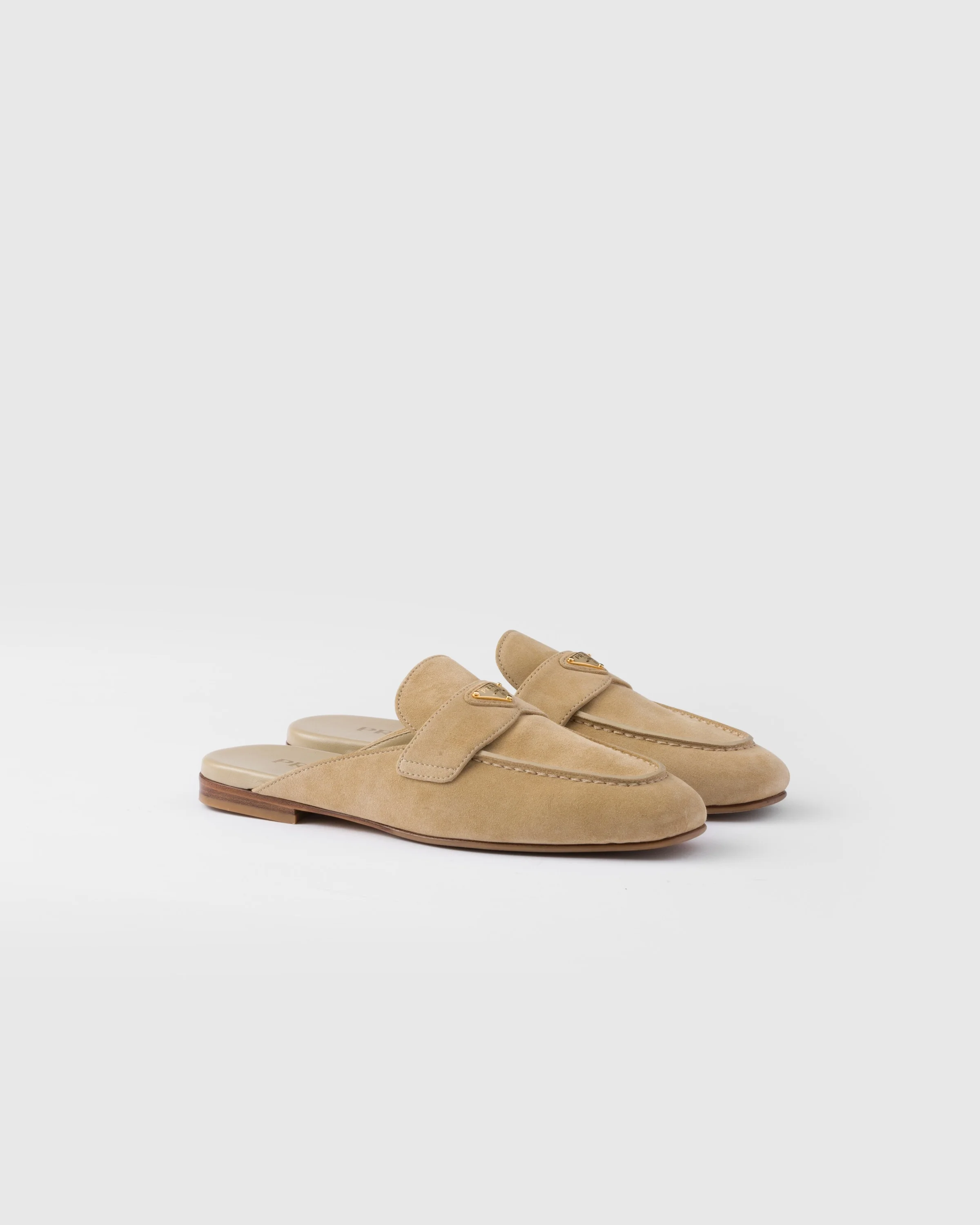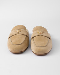 These soft suede slippers feature a streamlined silhouette with a casual attitude, embellished by the enameled metal triangle logo. - Product code: 1D766N_103_F0379_F_010 - Upper with leather band - Enameled metal triangle logo--Leather and rubber sole with hot-stamped logo - Heel height: 10 mm - Imported MATERIALS Main material: Calfskin