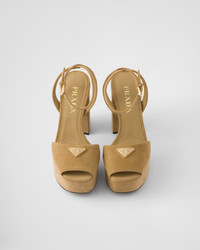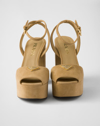 The iconic geometric shape of the triangle logo embellishes these suede sandals with sophisticated charm. The contemporary high-heeled platform silhouette is completed with refined ankle straps. - Product code: 1XP48B_008_F0379_F_115 - Straps with logo-engraved buckles - Enameled metal triangle logo - Leather and rubber sole with metal lettering logo - Suede-covered heel, height 115 mm - Suede-covered platform, height 40 mm - Imported MATERIALS Main material: Goatskin