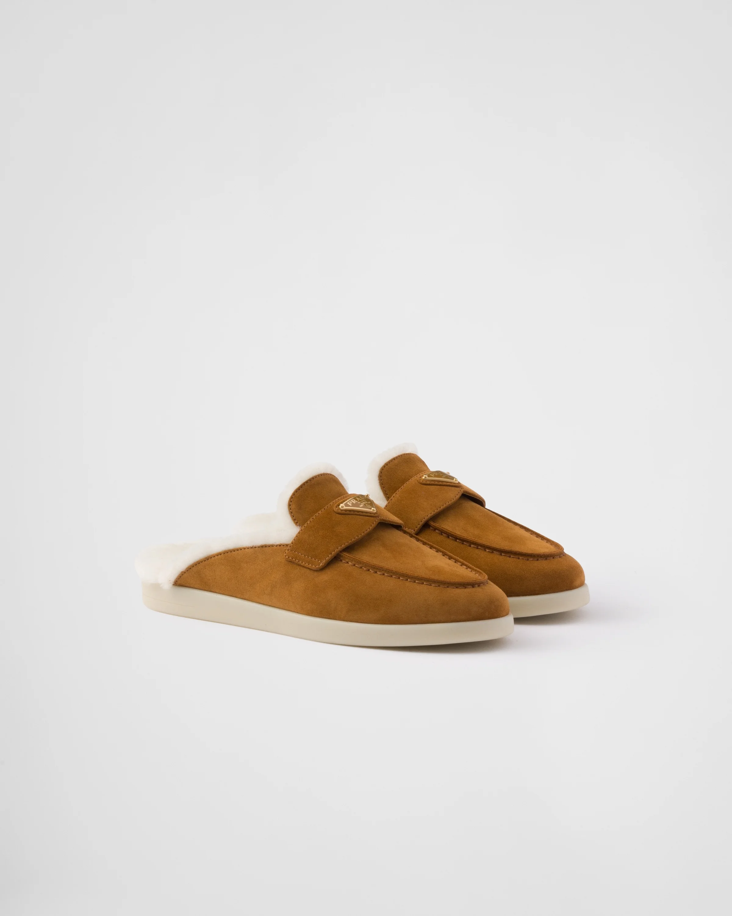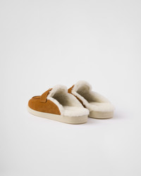 These suede slippers with a sleek, modern silhouette are completed by a soft shearling lining. - Product code: 1D270N_3LPM_F0046_F_ZB25 - Upper with leather band - Enameled metal triangle logo - Rubber sole, 25 mm - Triangle-patterned tread - Imported MATERIALS Main material: Calfskin