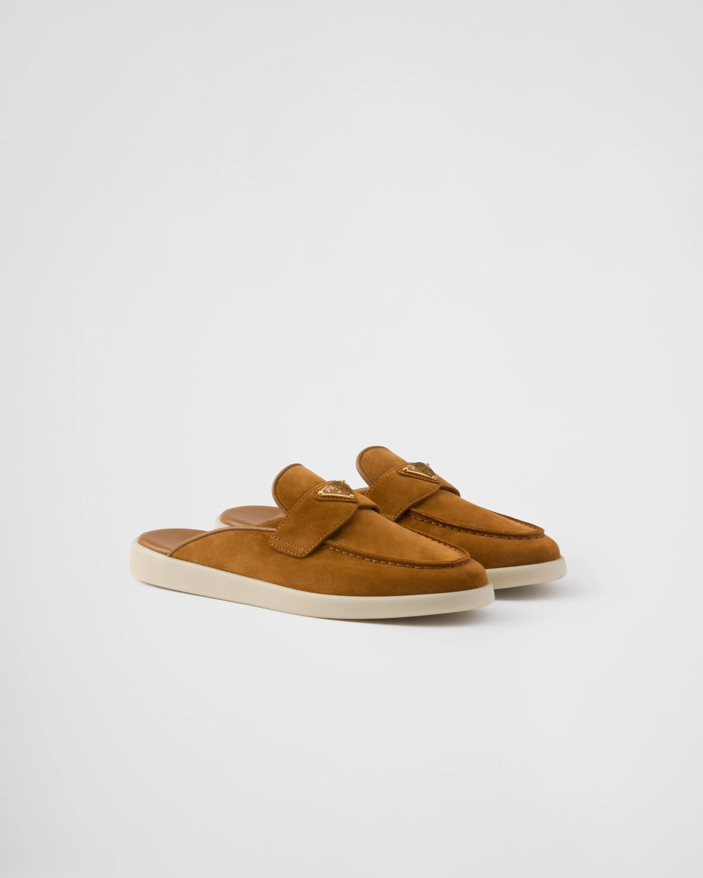 Modern silhouette for these mules made of soft suede with a leather lining. The enameled metal triangle logo embellishes the band, while the rubber sole adds a casual and versatile note to the design. - Product code: 1D270N_3LOL_F0046_F_B025 - Upper with leather band - Leather lining - Enameled metal triangle logo - Rubber sole - Removable leather-lined insole - Imported MATERIALS Main material: Calfskin