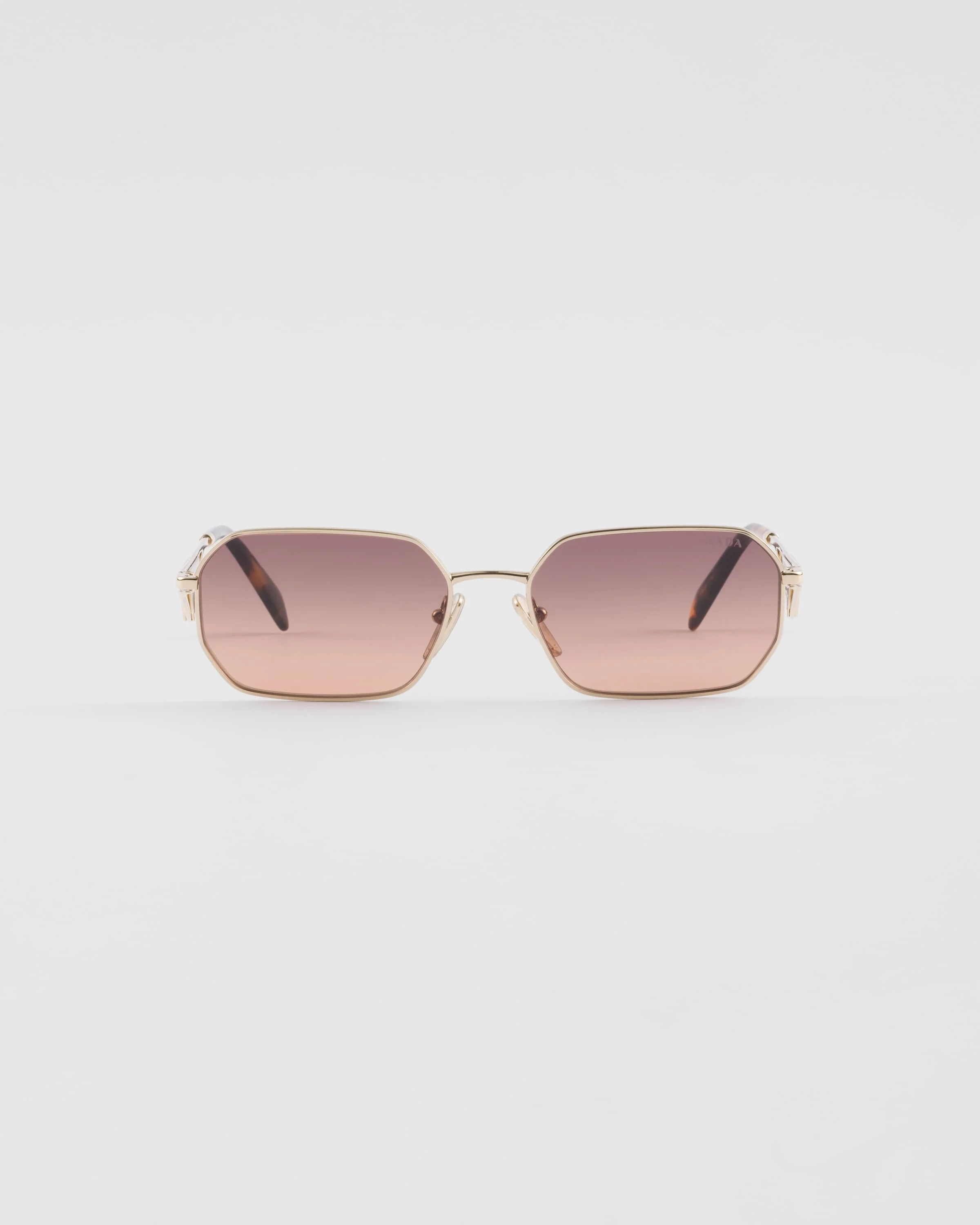 Metal sunglasses characterized by a narrow rectangular front with a bold attitude. The temples are embellished with the iconic triangle logo inspired by Prada jewelry. - Product code: SPRA51_EZVN_FE50C_C_058 - Metal frame front - Color: Pale Gold - Frame compatible with graduated lenses - 100% UVA / UVB protection - Adjustable nose pads suitable for any fit - Lens-nose-temple measurements: 58-17-140 mm - Article comes with dedicated packaging - Other colors available - Imported MATERIALS Metal