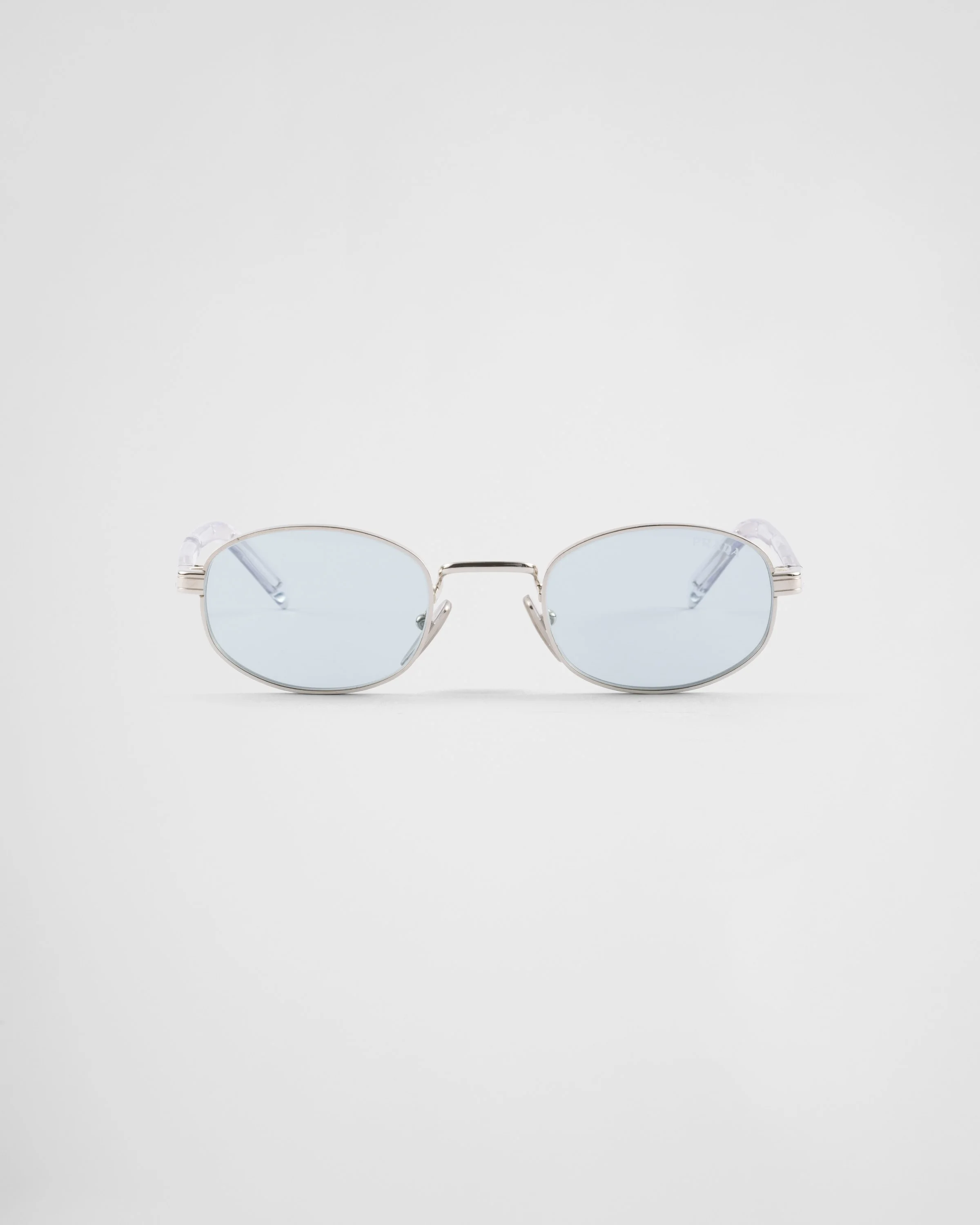 Metal sunglasses with a sleek, contemporary style. The oval front is combined with thin temples highlighted by the sophisticated metal elements and the finely engraved Prada lettering logo. - Product code: SPRB53_E1BC_FE40N_C_052 - Metal frame front - Color: Silver - Frame compatible with graduated lenses - 100% UVA / UVB protection - Adjustable nose pads suitable for any fit - Lens-nose-temple measurement: 52-22-145 mm - Article comes with dedicated packaging - Other colors available - Imported MATERIALS Metal