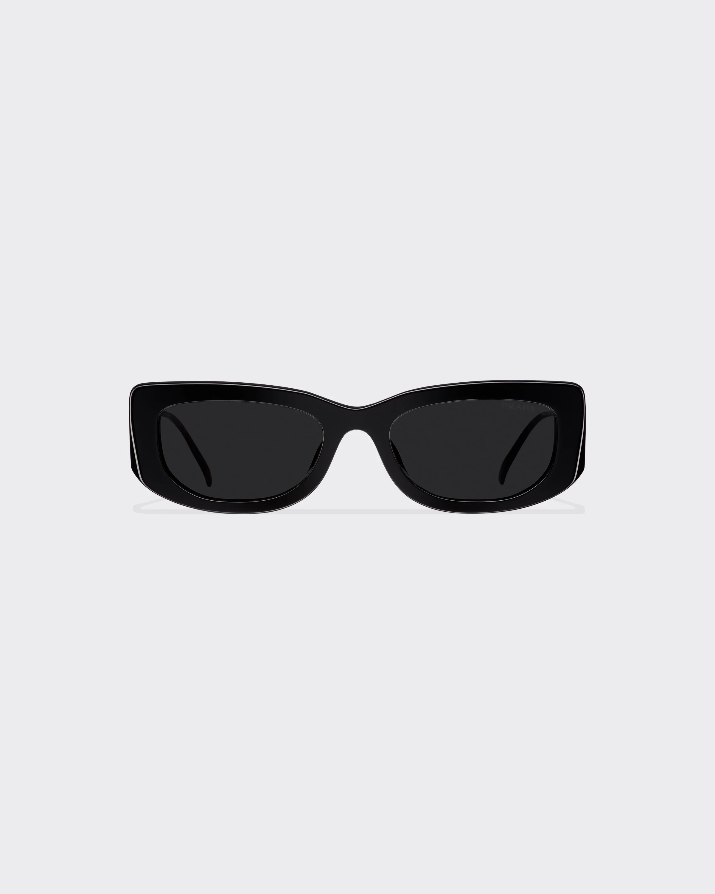 Acetate sunglasses with a glamorous touch. The rectangular frame front is paired with exclusive open metal temples decorated with an elegant Prada triangle logo insert inspired by jewelry of the maison. - Product code: SPR14Y_E1AB_F05S0_C_053 - Acetate frame front in black - Frame compatible with graduated lenses - 100% UVA / UVB protection - Full Fitting - Lens-nose-temple measurement: 53-19-140 mm - Article comes with dedicated packaging - Other available colors - Imported MATERIALS Acetate
