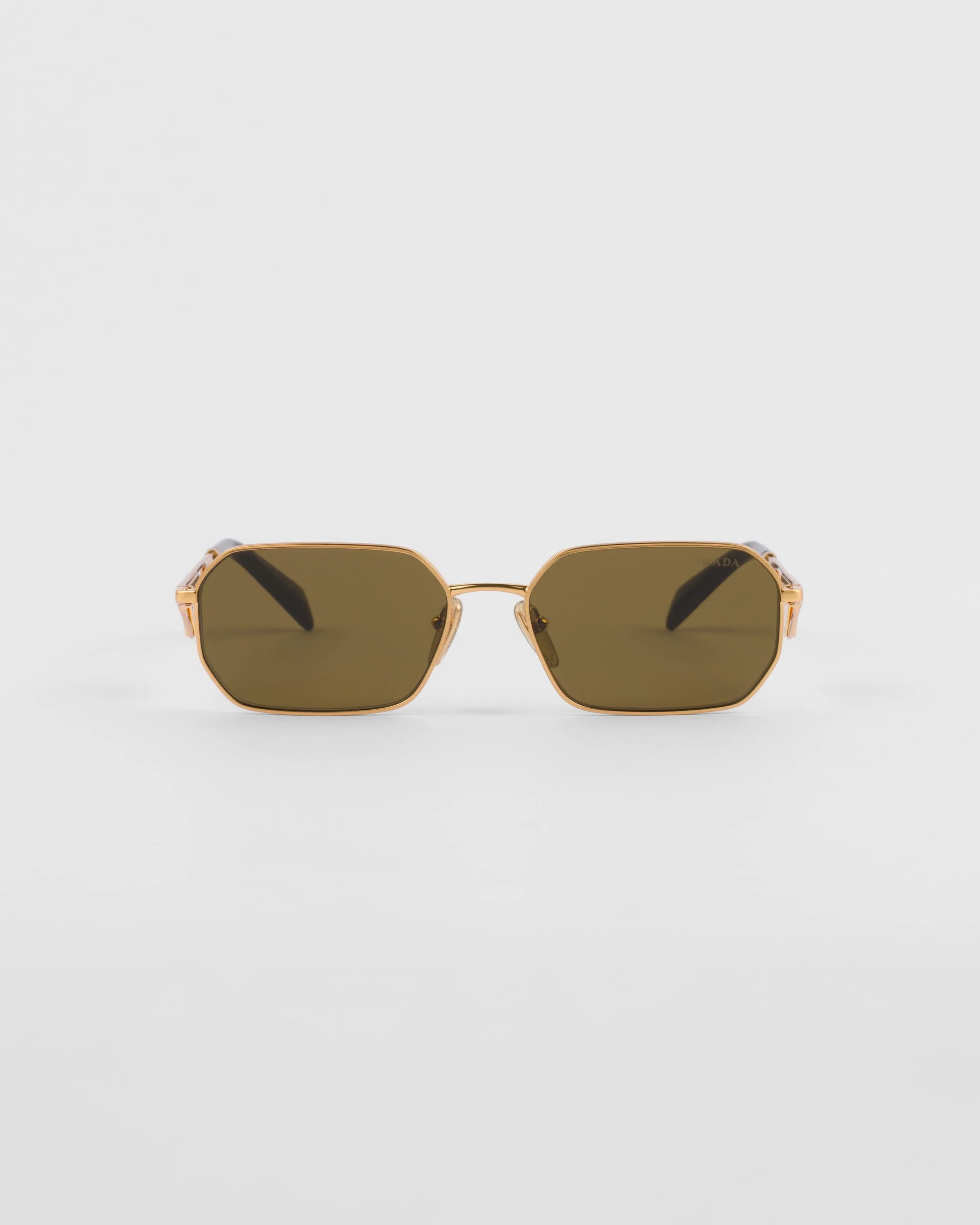 Metal sunglasses characterized by a narrow rectangular front with a bold attitude. The temples are decorated with the iconic triangle logo inspired by jewelry of the fashion house. - Product code: SPRA51_E15N_FE01T_C_058 - Metal frame front - Color: Brushed Pale Gold - Frame compatible with graduated lenses - 100% UVA / UVB protection - Adjustable nose pads suitable for any fit - Lens-nose-temple measurements: 58-17-140 mm - Article comes with dedicated packaging - Other available colors - Imported MATERIALS Metal