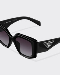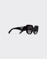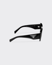 Acetate sunglasses with contemporary femininity. The oversized frame front with an irregular design features faceted rims and bold geometric lines. The wide temples are accented with an exclusive metal element depicting the iconic Prada triangle logo. - Product code: SPR14Z_E1AB_FE09S_C_050 - Acetate frame front - Black - Frame compatible with graduated lenses - 100% UVA / UVB protection - Standard fit - Lens-nose-temple measurement: 50-18-140 mm - Article comes with dedicated packaging - Other available colors - Imported MATERIALS Acetate