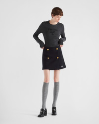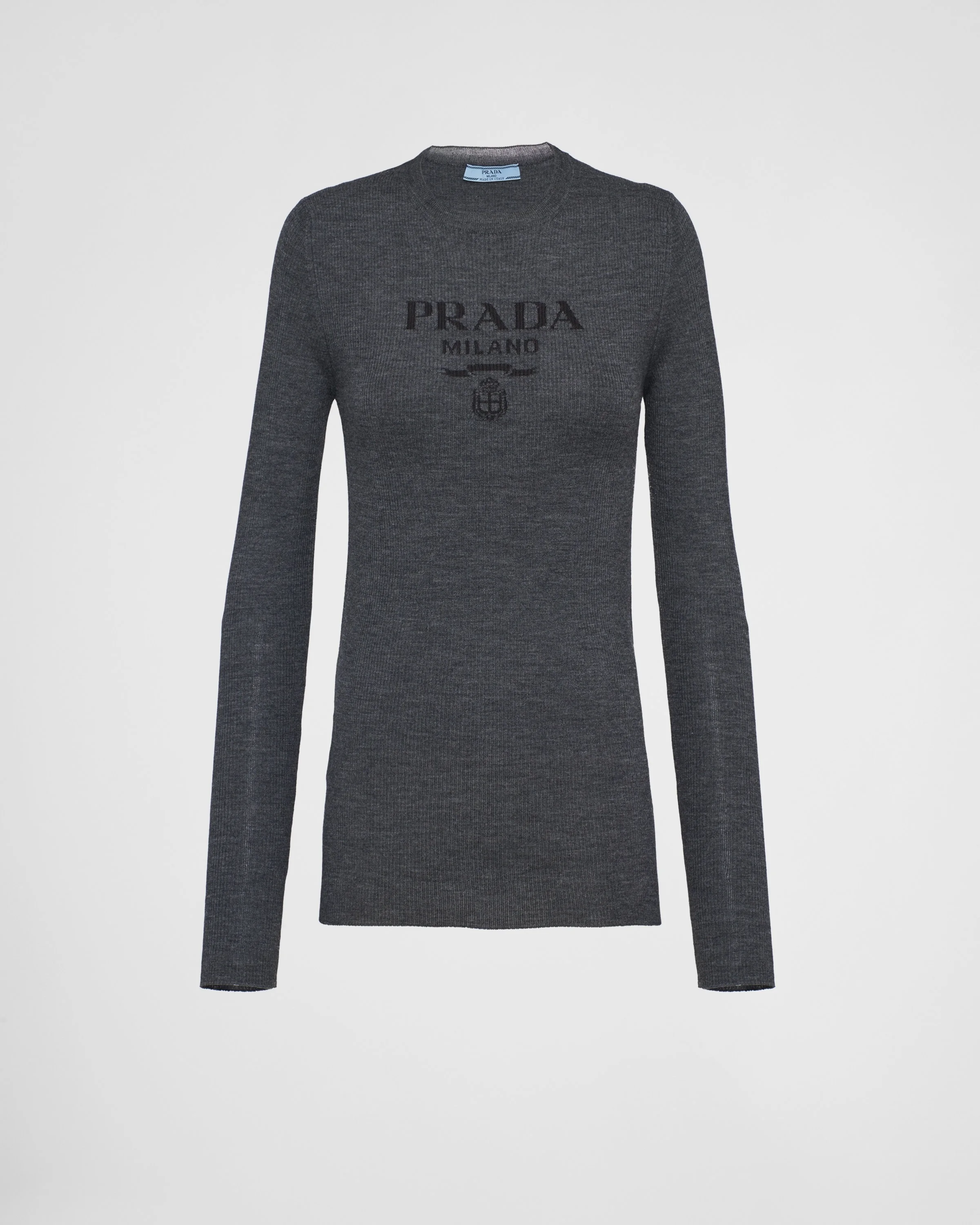 This crew-neck sweater reinterprets traditional knitwear in an innovative way with sleek lines and is made of superfine wool, a characteristic material used in Prada's most iconic knits. Superfine wool, the most valuable in the world, stands out for the fineness, extreme lightness, and exceptional length of the fibers, thanks to which it maintains its original shape over time. - Product code: P24R1V_11C8_F0308_S_232 - Long sleeves - Ribbed knit - Slim-fit silhouette - Ribbed knit crew neck - Raglan shoulder - Intarsia logo - Imported - The model is 178 cm tall and wears a size 38 Height: 64cm MATERIALS Main material: 100% virgin wool