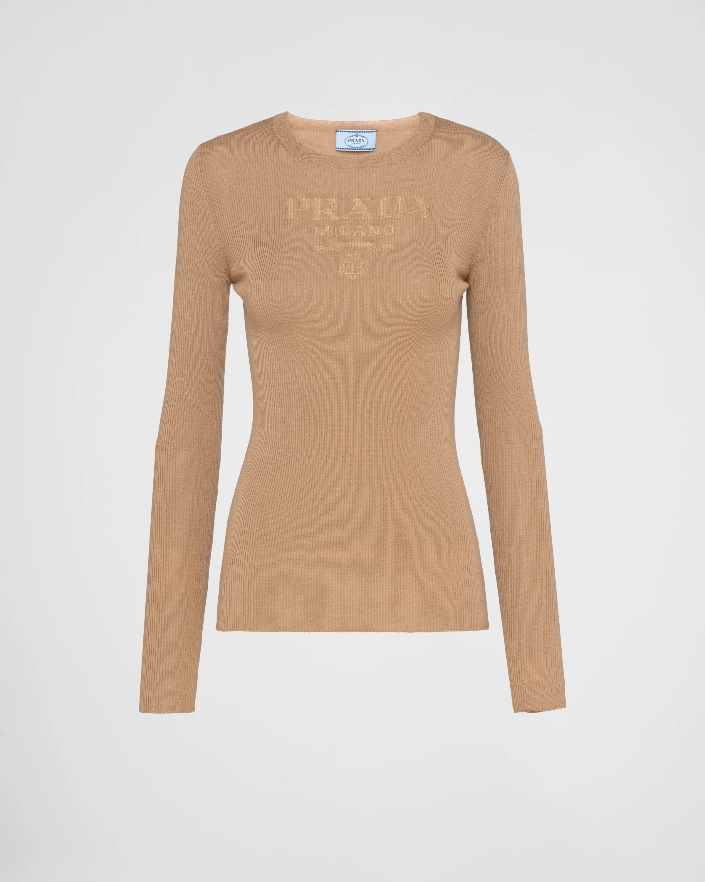 This crew-neck sweater reinterprets traditional knitwear in an innovative way with sleek lines and is made of superfine wool, a characteristic material used in Prada's most iconic knits. Superfine wool, the most valuable in the world, stands out for the fineness, extreme lightness, and exceptional length of the fibers, thanks to which it maintains its original shape over time. - 商品货号: P24R1V_11C8_F0040_S_232 - Long sleeves - Ribbed knit - Slim-fit silhouette - Ribbed knit crew neck - Raglan shoulder - Intarsia logo - 产品标签信息 高度: 64cm MATERIALS Wool