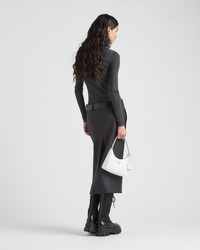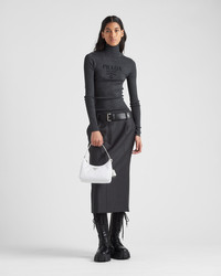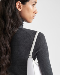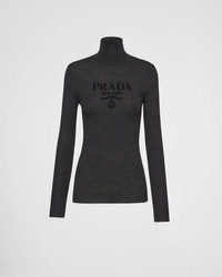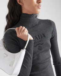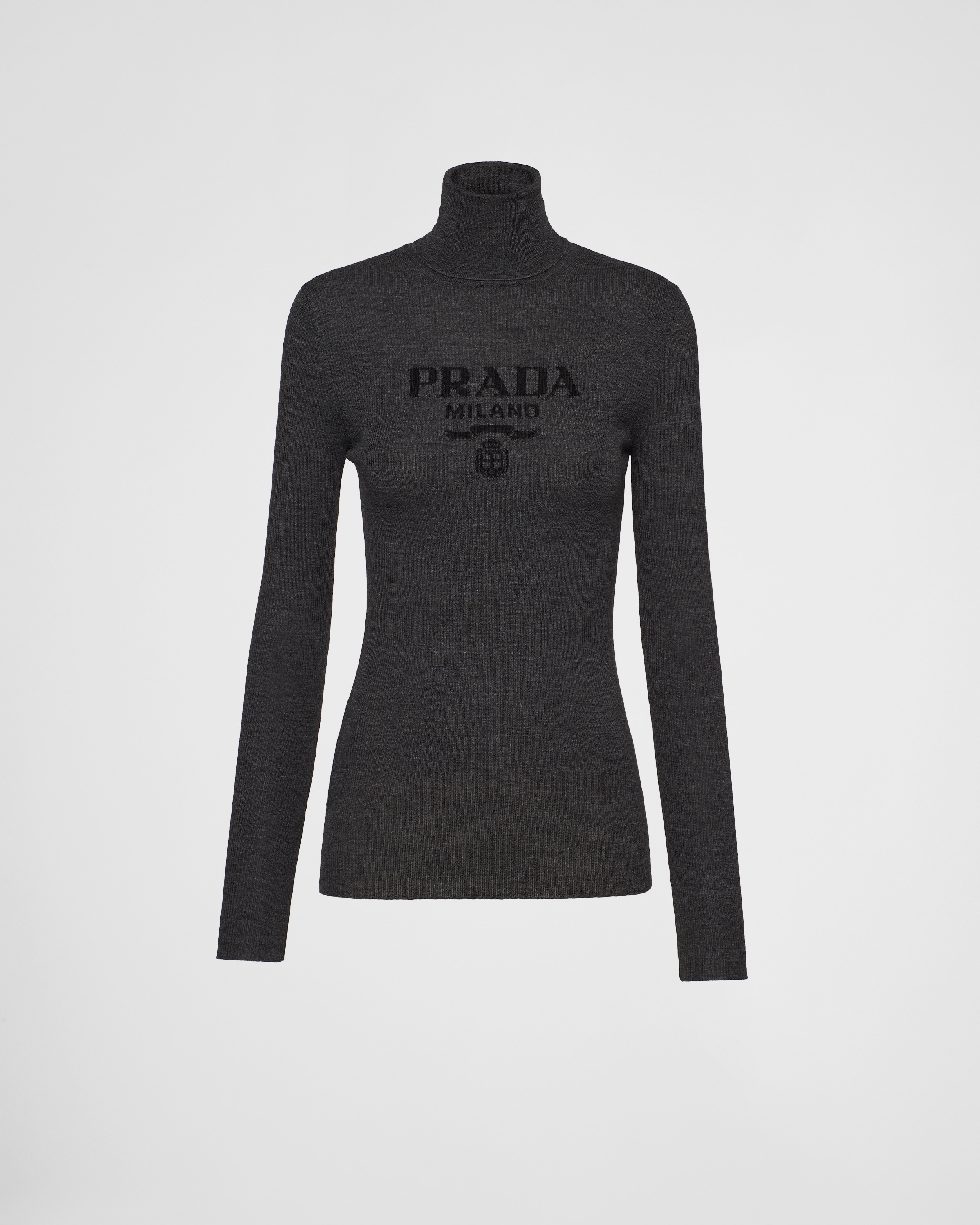 This turtleneck with sleek, timeless lines is made of superfine wool, a characteristic fabric of Prada's most iconic knitwear. Superfine wool stands out for its fineness, extreme lightness and the exceptional length of its fibers, which make it possible to maintain its original shape over time. - Product code: P26445_11C8_F0308_S_222 - Long sleeves - Ribbed knit - Slim fit - Ribbed knit turtleneck - Raglan sleeve - Intarsia logo - Imported - The model is 176 cm tall and wears a size 38 Height: 64cm MATERIALS Wool