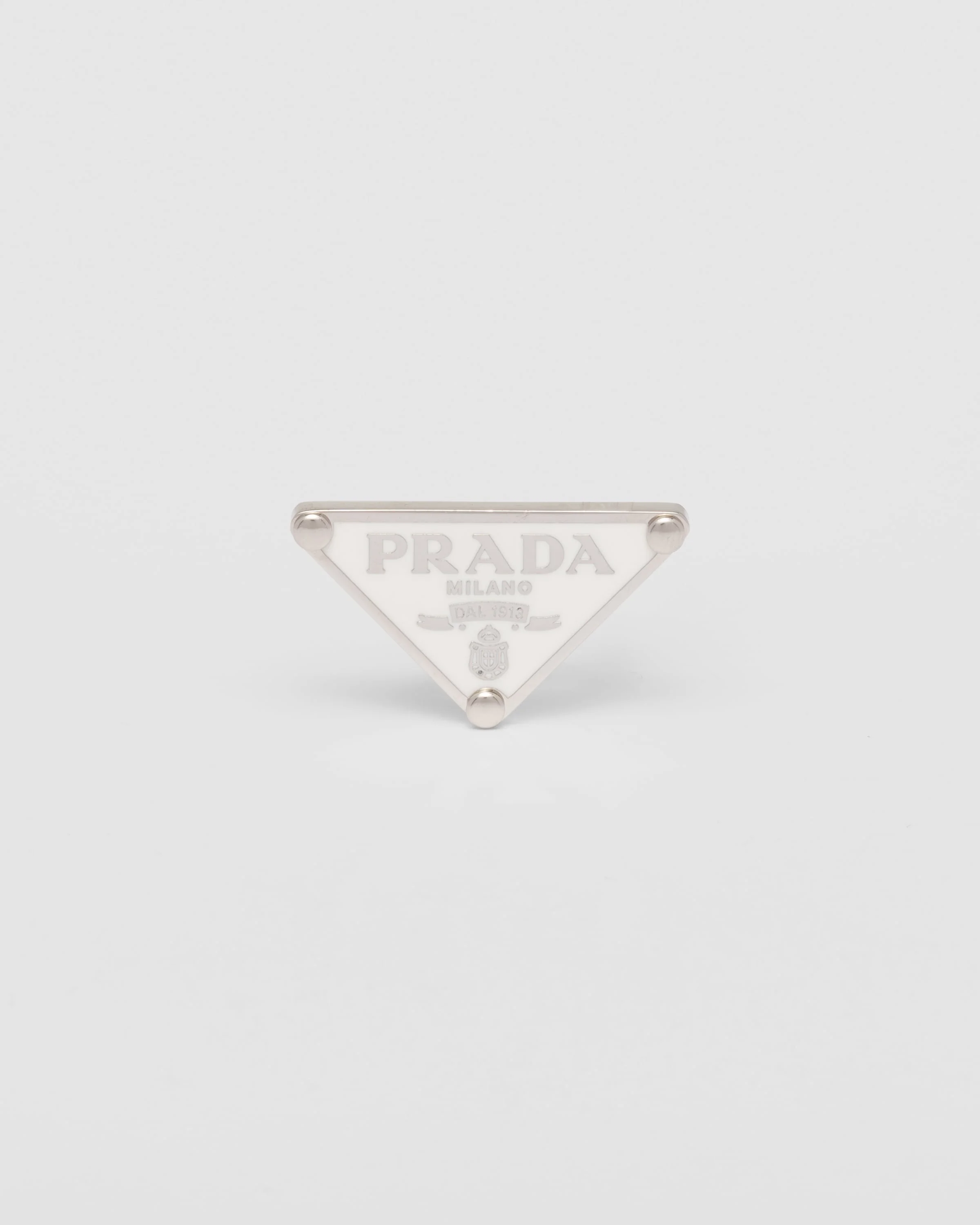 Prada's historic symbol decorated with enamel defines this single earring worn on the left. Iconic and sleek, the triangle logo is the protagonist of a new line of jewelry made of 925 sterling silver that reinterprets punk influences in a modern way. - Product code: 1JO722_2DSP_F0009 - 925 sterling silver with enamel - Palladium finish - Visible logo - Clip back earring - Left ear - Imported Width: 3.2cm MATERIALS Main material: 925 silver