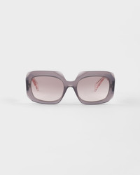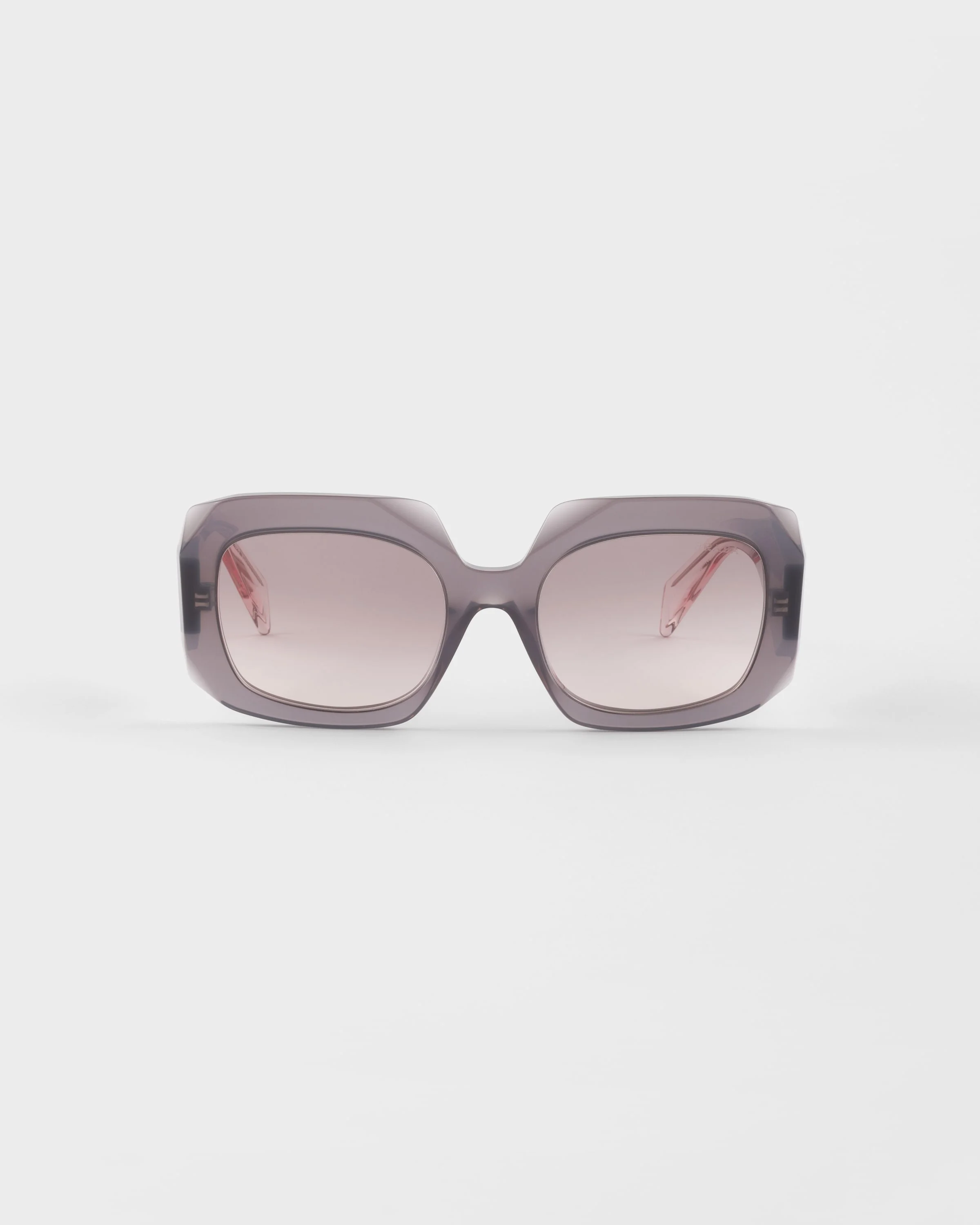 Acetate sunglasses with a geometric design and important volumes. The bold frame features an oversized square front defined by sharply beveled outer rims. The three-dimensional workmanship on the temples is decorated with an iconographic interpretation of the traditional Prada triangle logo. - Product code: SPRB23_E20F_FE70S_C_054 - Recycled bio-acetate frame front - Color: Gray + Gradient Gray to Pink - Frame not compatible with graduated lenses - 100% UVA / UVB protection - Standard Fit - Lens-nose-temple measurement: 54-20-145 mm - Article comes with dedicated packaging - Other colors available - Imported MATERIALS Acetate