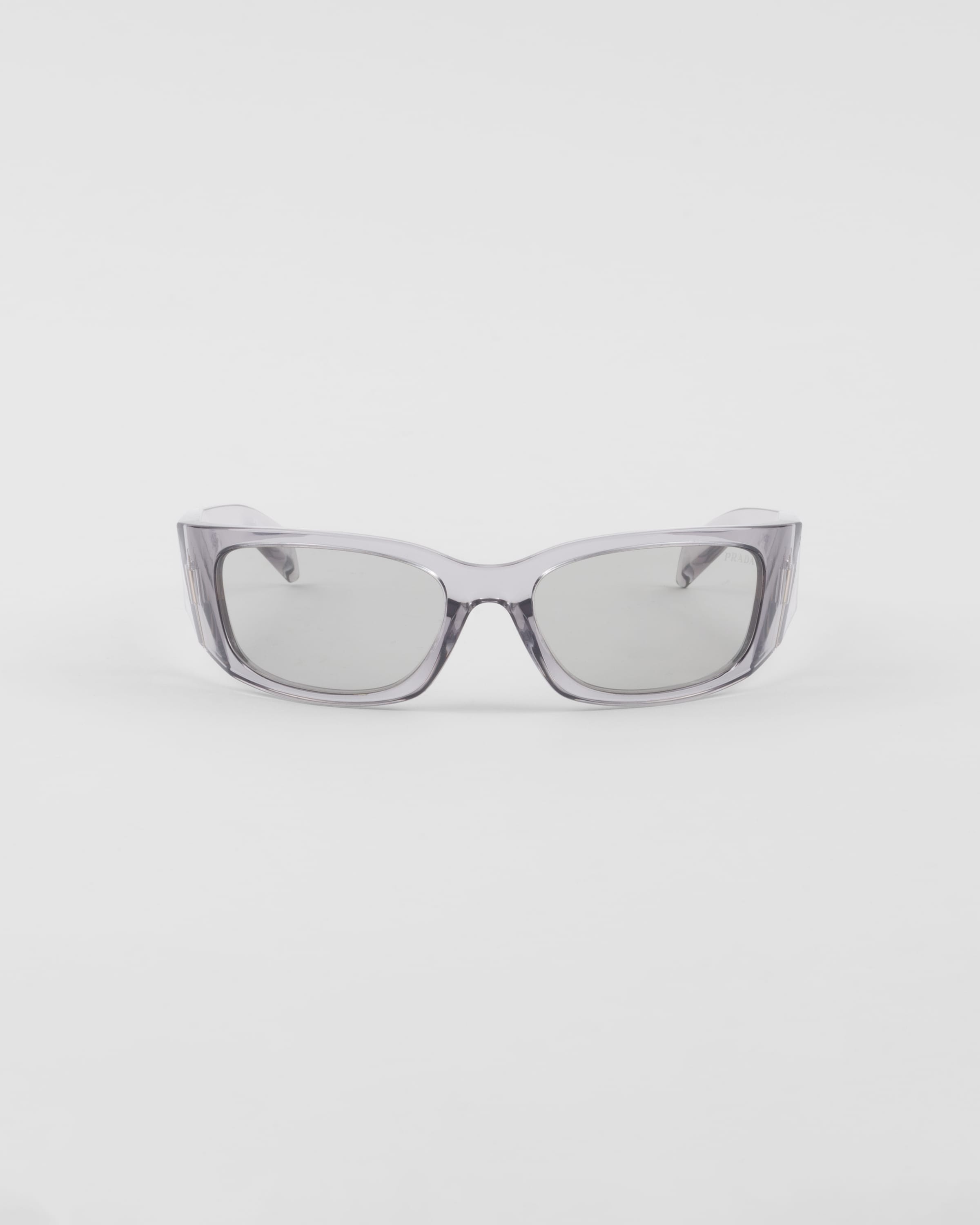 These new Prada Symbole sunglasses feature enveloping, contemporary lines. The three-dimensional crafting of the temples creates bold geometric shapes marked by an iconographic interpretation of the iconic Prada triangle logo. - Product code: SPRA14_E12R_FE30B_C_060 - Nylon frame front - Color: Transparent Gray - Frame not compatible with graduated lenses - 100% UVA / UVB protection - Standard fit - Lens-nose-temple measurements: 60-18-120 mm - Article comes with dedicated packaging - Other colors available - Imported MATERIALS Acetate