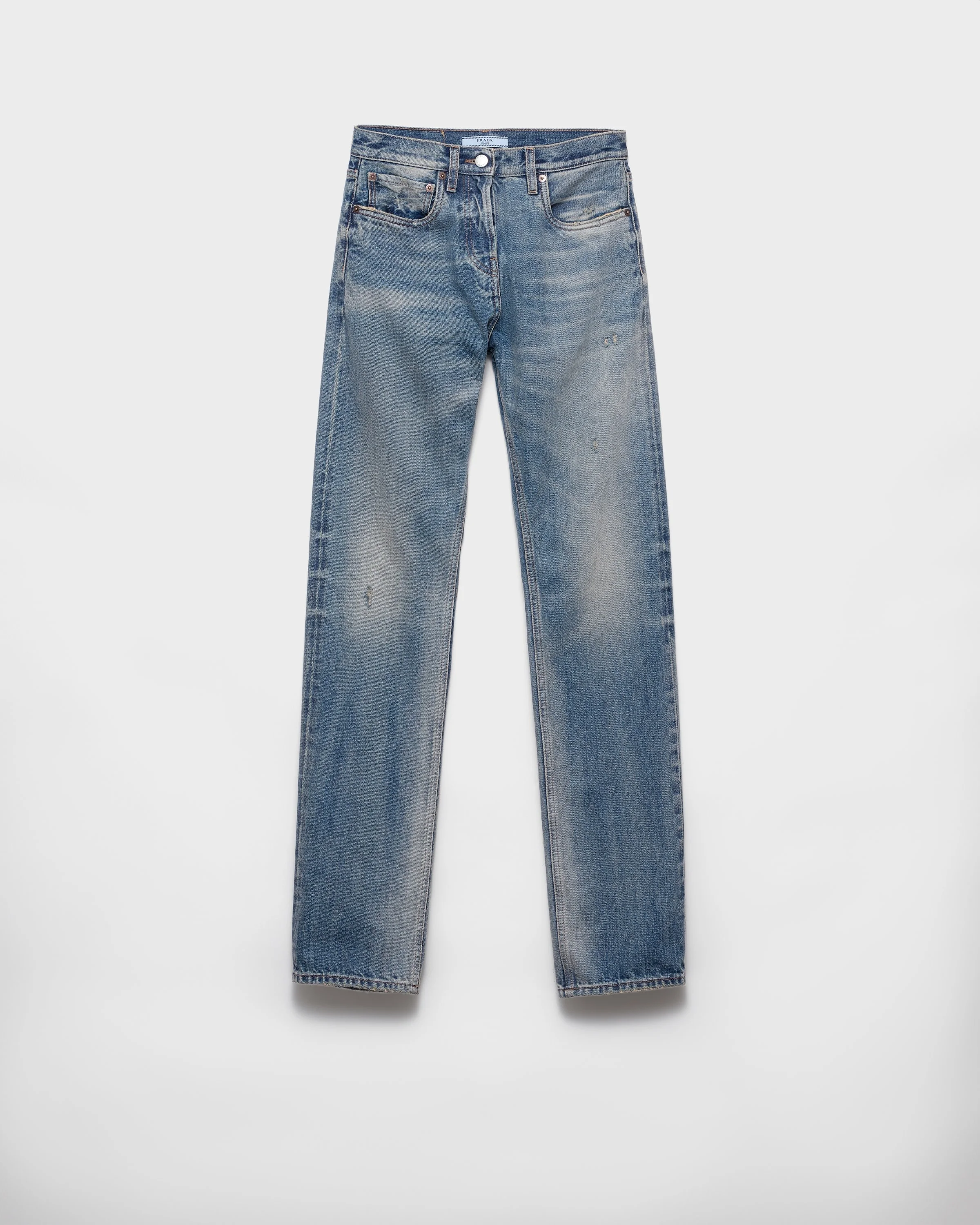 Bleached denim gives vintage allure to these low-rise jeans with a tapered cut. Contrasting top-stitching and distressed details complete the garment with distinctive style decorated with an archive logo printed on the label. - Product code: GFP530_1703_F0008_S_UOO - Bleached treatment - Tapered fit - Low-rise waist - Hem width: 18.5 cm, size: 25 - Button fly - Contrasting top-stitching. - Total length 112 cm, Size: 25 - Pressed garment - Prada Milano logo label on the back - Imported - The model is 178 cm tall and wears a size 38 Height: 110cm MATERIALS Main material: 100% cotton