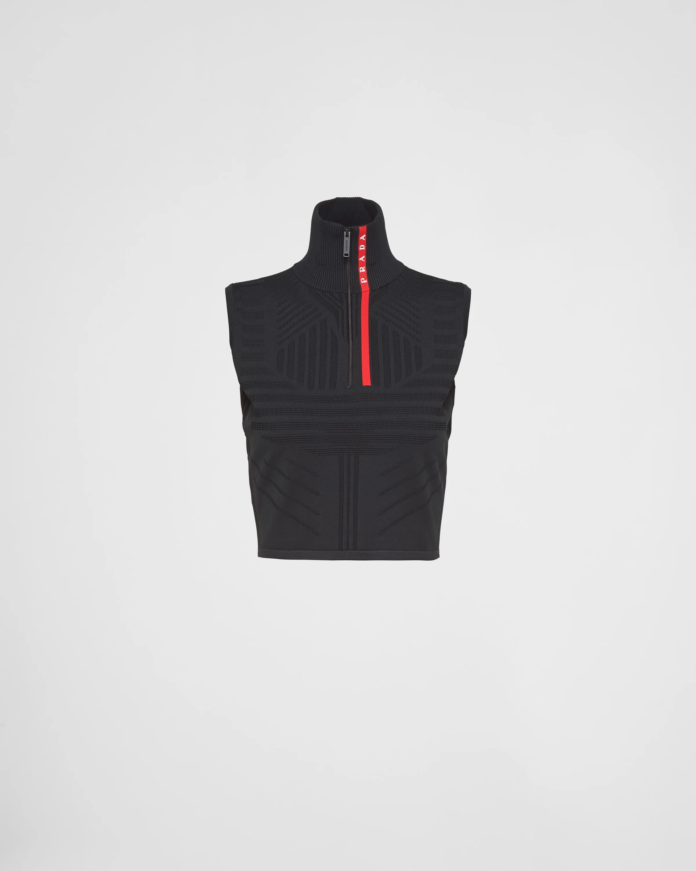 A cropped, fitted silhouette characterizes this sleeveless top that blends technical elements and a sporty inspiration. Made from high quality post-consumer recycled Japanese polyester and Lycra yarns, Nylon Tech Rec is a naturally stretchy, lightweight and water-repellent knit. Featuring a pique motif with contoured lines, the design with ribbed knit turtleneck is accented with a front zipper reminiscent of the sports world and the embroidered Prada Linea Rossa logo. This product does not contribute to the SEA BEYOND educational program. - Product code: 129307_1X79_F0002_S_192 - Tech Rec Nylon F.18 in post-consumer recycled polyester - Pique motif - Slim fit - Ribbed knit collar - Sleeveless - Embroidered logo - Front zipper closure - Imported - The model is 178 cm tall and wears a size 38 Height: 38cm MATERIALS Main material: 100% polyester