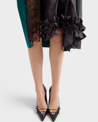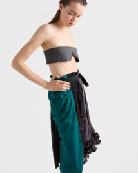 A bold encounter between fine materials and iconic Prada lines creates this skirt with a distinctive character. The patchwork technique sculpts an asymmetrical silhouette, enriched with ruching, lace and pleats that create dynamic volumes, an expression of a free and unconventional elegance. - Product code: P147IG_19QW_F063H_S_OOO - Wraparound silhouette - Garment with petticoat - Center-back closure with buttons and ribbon - Asymmetrical insert detail - The garment is formed by panels of different fabrics joined along vertical lines - Grosgrain belt - Imported Height: 70cm MATERIALS Main material: 100% Silk