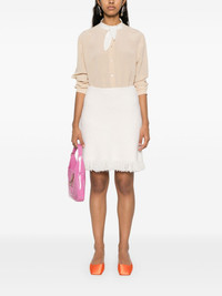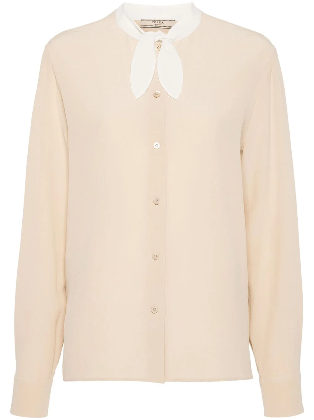 triangle-logo crepe shirt Highlights - Beige - Crepe texture - Gathered tie neck - Long sleeves - Buttoned cuffs - Short side slits - Triangle logo - Straight hem - Front button fastening Composition Silk 100% SIZE & FIT Model measurements Height 5 ft 9 in(1.76 m) Bust/Chest 31.1 in(79 cm) Hips 36.61 in(93 cm) Waist 24.8 in(63 cm) FittingInformation Designed for a relaxed fit, this piece allows for comfort and movement when worn Made from a lightweight non-stretch fabric This piece fits true to size – take your usual size Washing instructions Dry Clean Only