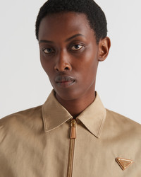 This chino blouson jacket with contemporary appeal features a boxy silhouette defined by the shirt-style collar and two large patch pockets. The cropped style is enhanced by distinctive details like the iconic enameled metal triangle logo. - رمز المنتج: P536O_10YP_F0065_S_OOO - Boxy fit - Cotton lining - Shirt-style collar - Front zipper closure - Shirt-style sleeves - Patch pockets - Leather triangle with enameled metal triangle logo - The model is 180 cm tall and wears a size 38