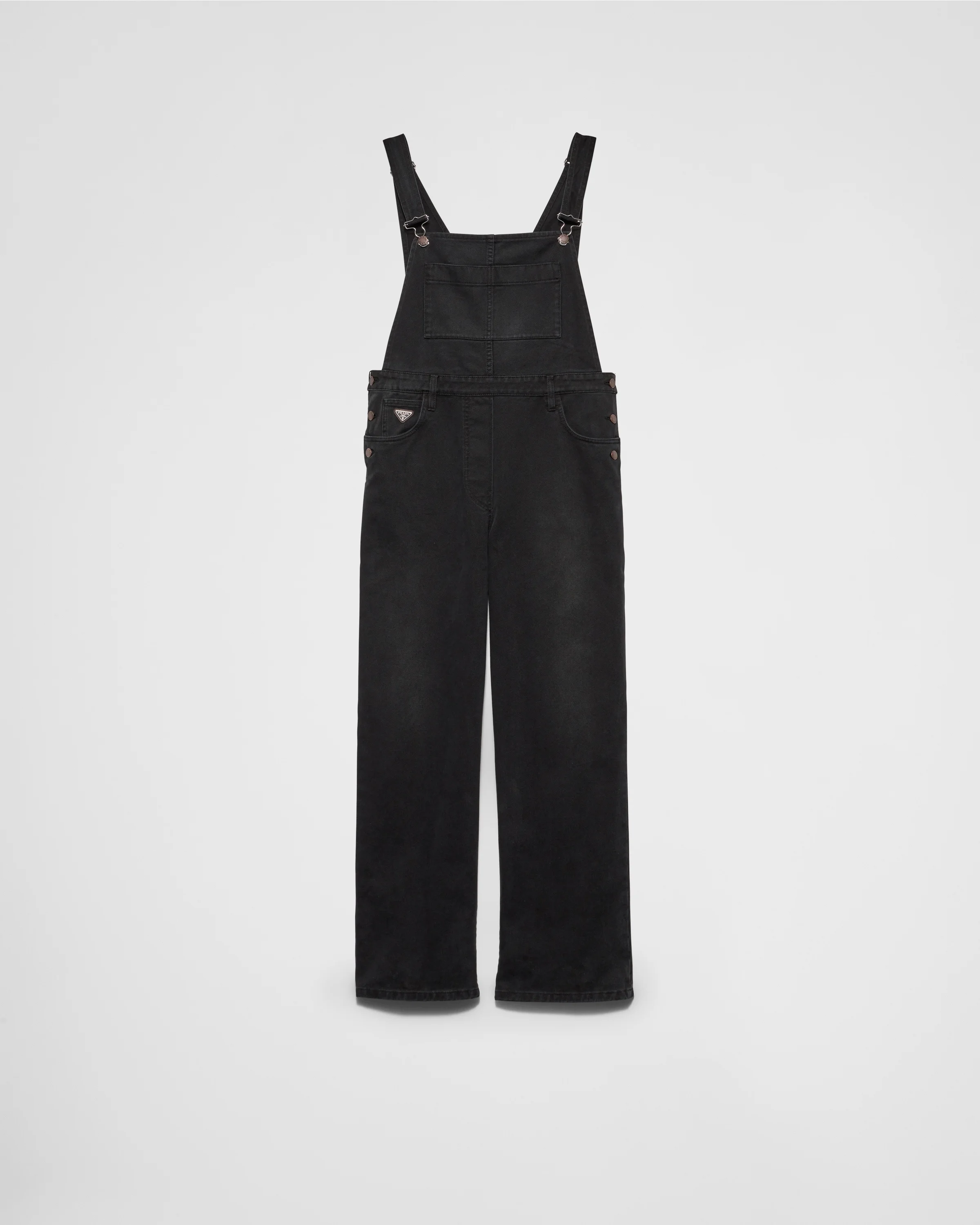 These casual overalls made of washed denim have a loose-fit silhouette. The workwear-inspired style with classic details is decorated with an archive logo printed on the label and by the iconic enameled metal triangle logo. - Code du produit: GFZ013_148J_F0557_S_OOO - Garment-dyed with washed treatment - Loose fit - Unlined - Side and front button closure - Matching stitching - Triangle logo - Center-back length: 155 cm, Size: 38 - Patch pocket on bib - Low rounded pockets with coin pocket on the front - Strap with buckle on the back - Prada Milano logo label on the back - Importe - The model is 180 cm tall and wears a size 38 Taille: 158cm MATERIALS Cotton