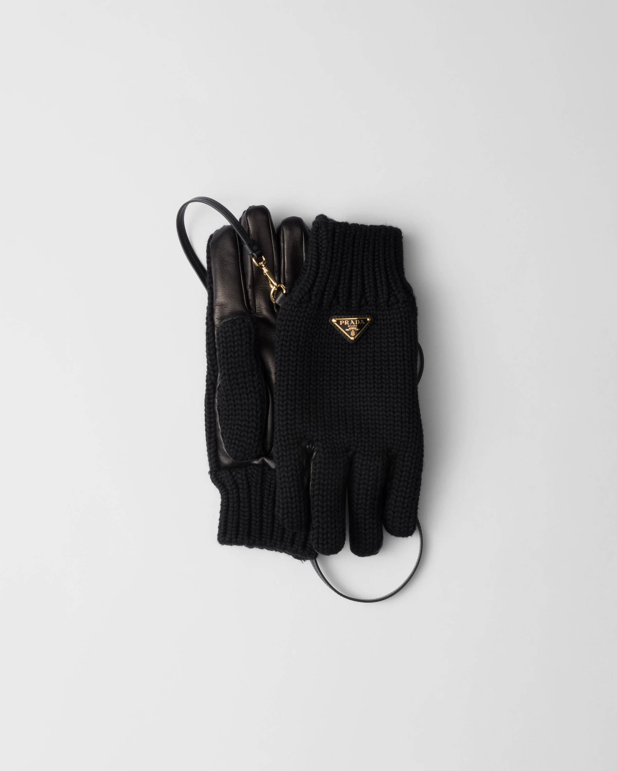 The iconic enameled metal triangle logo embellishes these versatile and refined wool and nappa leather gloves completed with a removable leather strap. - Product code: 1GG189_2DZL_F0002 - With removable leather strap - Enameled metal triangle logo - Fleece lining - Imported MATERIALS Main material: Virgin wool