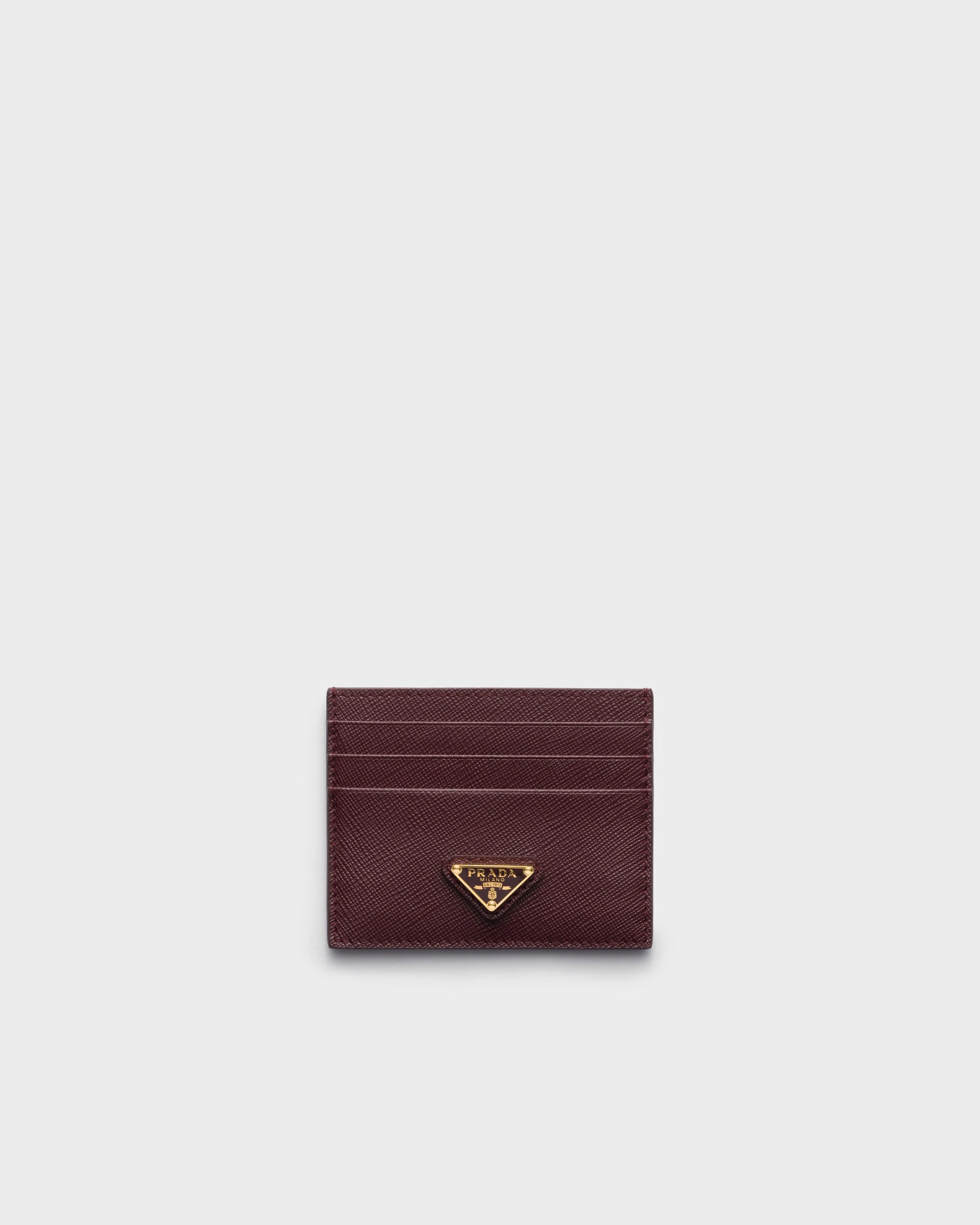 The unmistakable texture of Saffiano leather characterizes this sleek card holder. The accessory with six card slots is decorated with a tonal enameled metal triangle logo. - Product code: 1MC025_QHH_F0007 - Enameled metal triangle logo - Six card slots - One inside pocket - Moire and Saffiano leather lining - Imported Height: 8cm Width: 10cm MATERIALS Main material: Calfskin