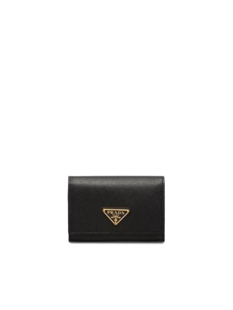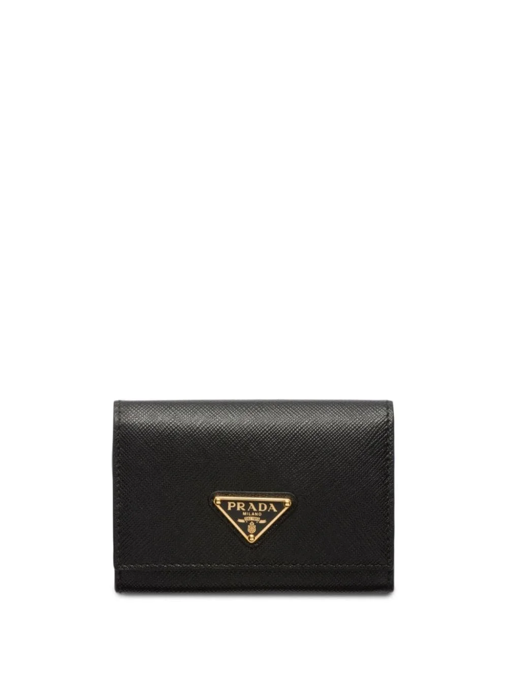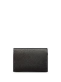 triangle-logo leather cardholder Highlights - Black - Saffiano leather - Textured finish - Enamel triangle logo - Bi-fold design - Internal card slots Composition Outer: Leather 100% SIZE & FIT Measurement LENGTH 4.33 in(11 cm) WIDTH 2.75 in(7 cm)
