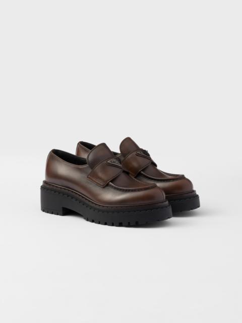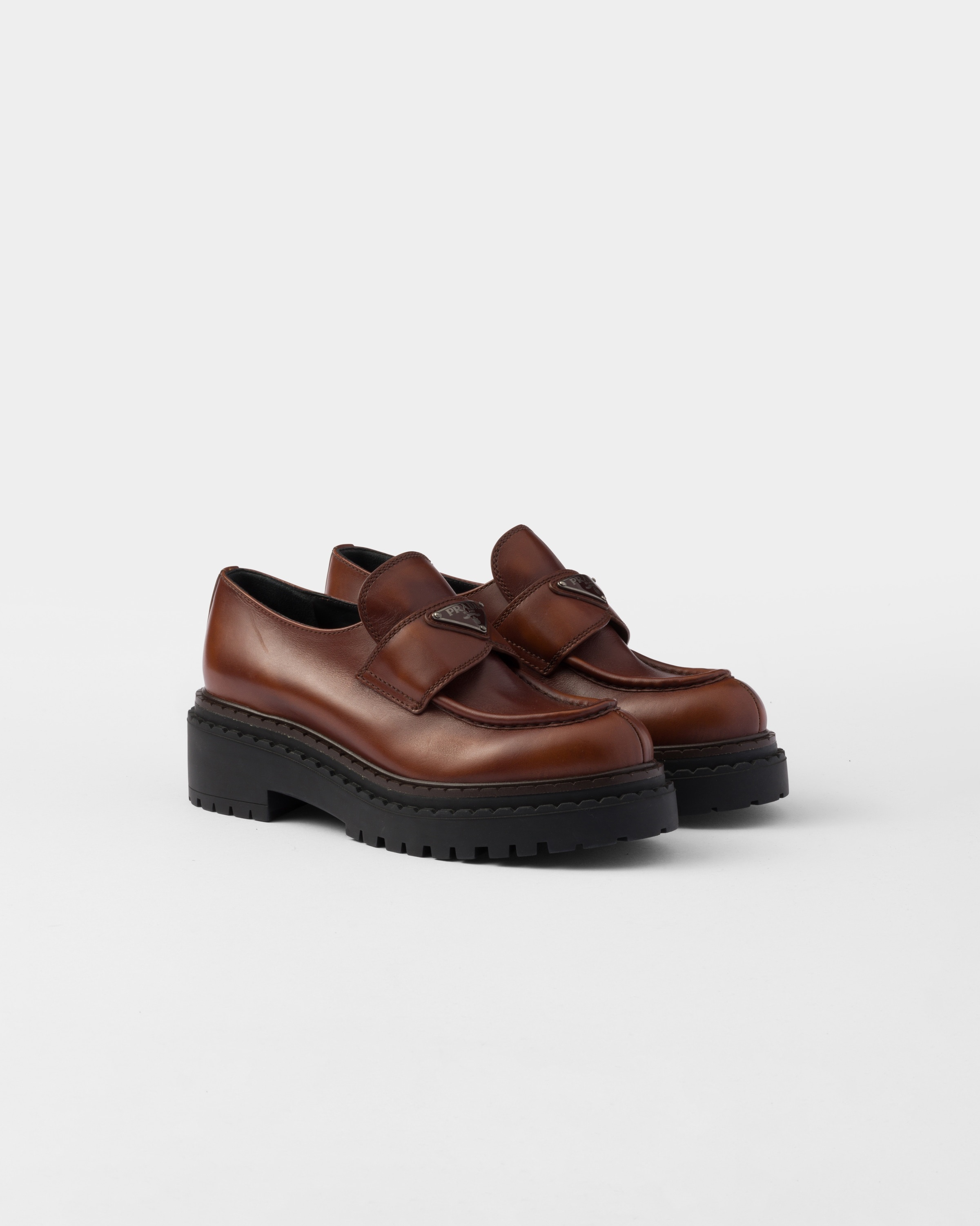 Finely crafted details and contemporary elements animate the design of these leather loafers with chunky rubber soles in a new interpretation of an iconic style. - 商品品番: 1D246M_3LPV_F0046_F_G055 - Upper with leather band - Enameled metal triangle logo - Monoblock rubber sole with lug tread, 55 mm, and hot-stamped logo - Double rubber welt with notched effect - インポート MATERIALS Leather