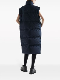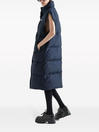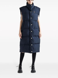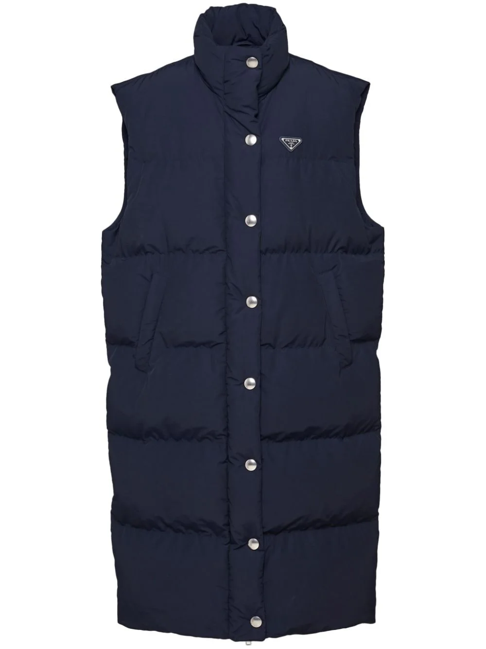 triangle-logo padded long vest Prada spotlights its propensity for functional outerwear with this long vest. Rendered in navy blue, the padded outer is insulated with goose down and finished with the iconic enamel triangle logo. Highlights - Navy blue - Goose down - Padded design - Enamel triangle logo - High neck - Front press-stud fastening - Sleeveless - Two side welt pockets - Below-knee length - Straight hem Composition Lining: Goose Down 100% Outer: Cotton 100%