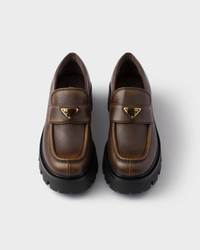 These vintage-effect leather loafers combine classic elements and contemporary volumes. The chunky soles made of lightweight yet durable rubber complete the footwear with artisan details decorated with the triangle logo. - Product code: 1D185O_DFW_F0324_F_050 - Enameled metal triangle logo - Monoblock rubber sole, 50 mm, with hot-stamped logo - Imported MATERIALS Main material: Calfskin