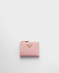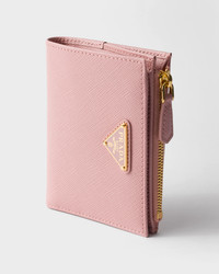 This Saffiano leather wallet with enameled metal triangle logo is sleek and elegant. The accessory with clean lines has a zipper coin compartment, bill compartment, and card slots. - Product code: 1ML050_QHH_F0924 - Snap closure - Enameled metal triangle logo - One bill compartment - Six card slots - Two internal pockets - Internal zipper coin compartment - Moire and Saffiano leather lining - Imported Height: 8.5cm Width: 11.5cm MATERIALS Main material: Calfskin