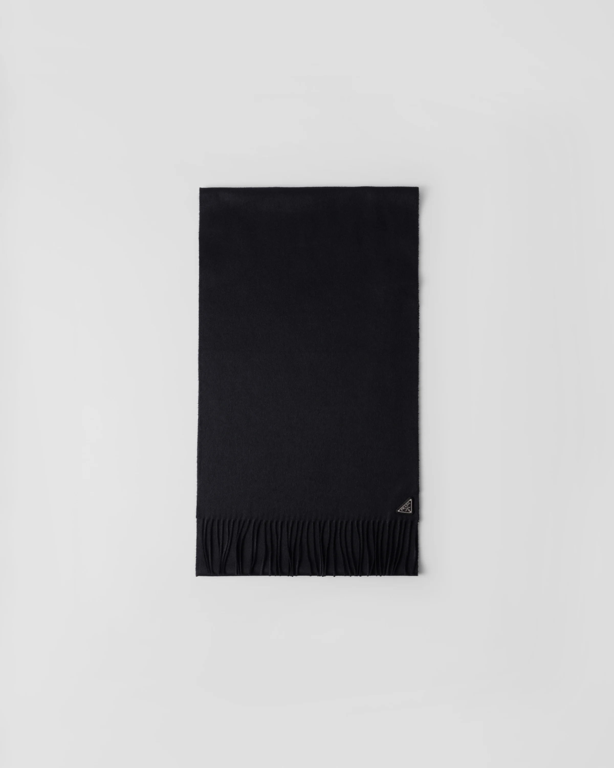 A luxurious silk and cashmere blend enhances the sleek design of this scarf with classic fringed edges. The soft and refined accessory is embellished with the iconic enameled metal triangle logo. - Product code: 1FS065_2COP_F0002 - Enameled metal triangle logo - Fringe on two sides - 51% silk 49% cashmere - Imported Height: 170cm Width: 35cm MATERIALS Main material: Silk cashmere