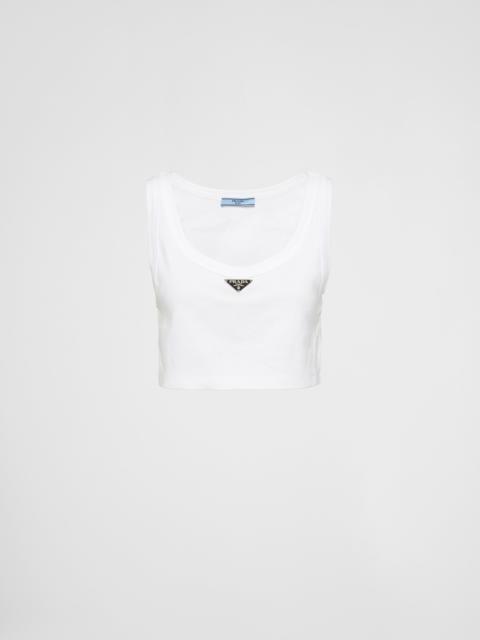 Pragmatic garments acquire new importance and value. This tank top with a typical menswear line is transformed by a feminine touch. Essentially Prada, the garment embodies the luxury of simplicity. The triangle logo stands out on the front. - Product code: 39546C_10Z0_F0002_S_231 - Cropped fit - Ribbed knit - Scoop neck - Enameled metal triangle logo - Imported - The model is 178 cm tall and wears a size 38 Height: 37cm MATERIALS Main material: 100% cotton