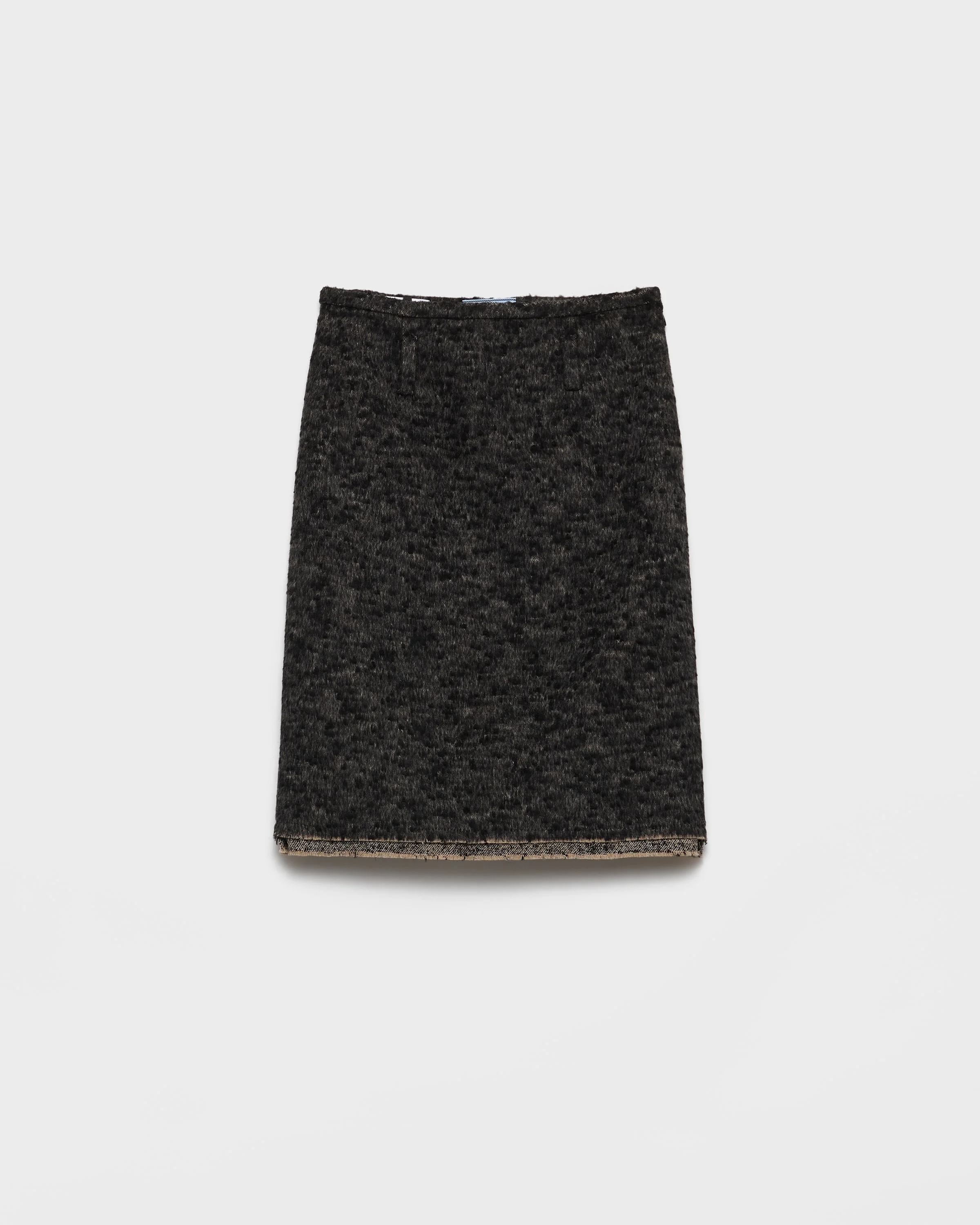 This sophisticated, feminine skirt has a straight silhouette created with refined craftsmanship. Double tweed gives structure to the design, characterized by the deliberately unfinished hem that reveals the sartorial essence of the timeless garment. - Product code: P104ZG_171S_F0308_S_OOO - Straight fit - Lined - Back slit - Side zipper closure with hook - Fabric triangle logo - Imported - The model is 180 cm tall and wears a size 38 Height: 68cm MATERIALS Main material: 10% polyamide 90% virgin wool