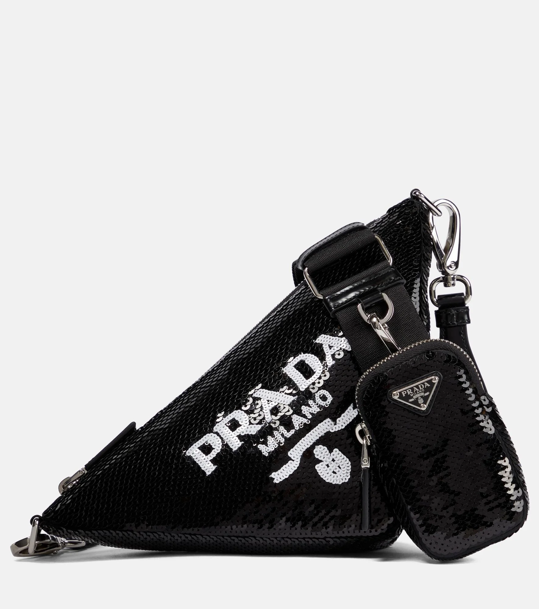 Prada's triangle bag is a fresh interpretation of the Italian brand's house code, the triangle. Made from sequin embellished fabric, the black style is accented with contrasting branding and comes with a detachable pouch. Product Details - Closure: zipped top - Detachable, adjustable chain and leather shoulder strap - Designer color name: Nero+Bianco - Material: fabric - Internal details: fabric lining - Made in Italy - Comes with dust bag - Comes with a box - Item number: P00696080 Size & Fit - Height 14cm-5.5" - Max. width 26cm-10" - Depth 6,5cm-2.5" - Min. length shoulder strap 92cm-36" - Max. length shoulder strap 132cm-52"