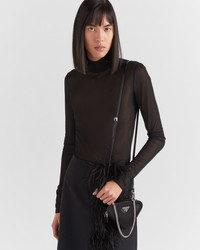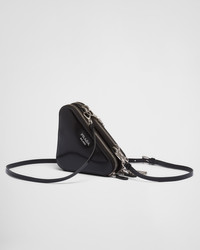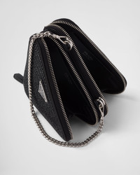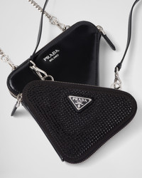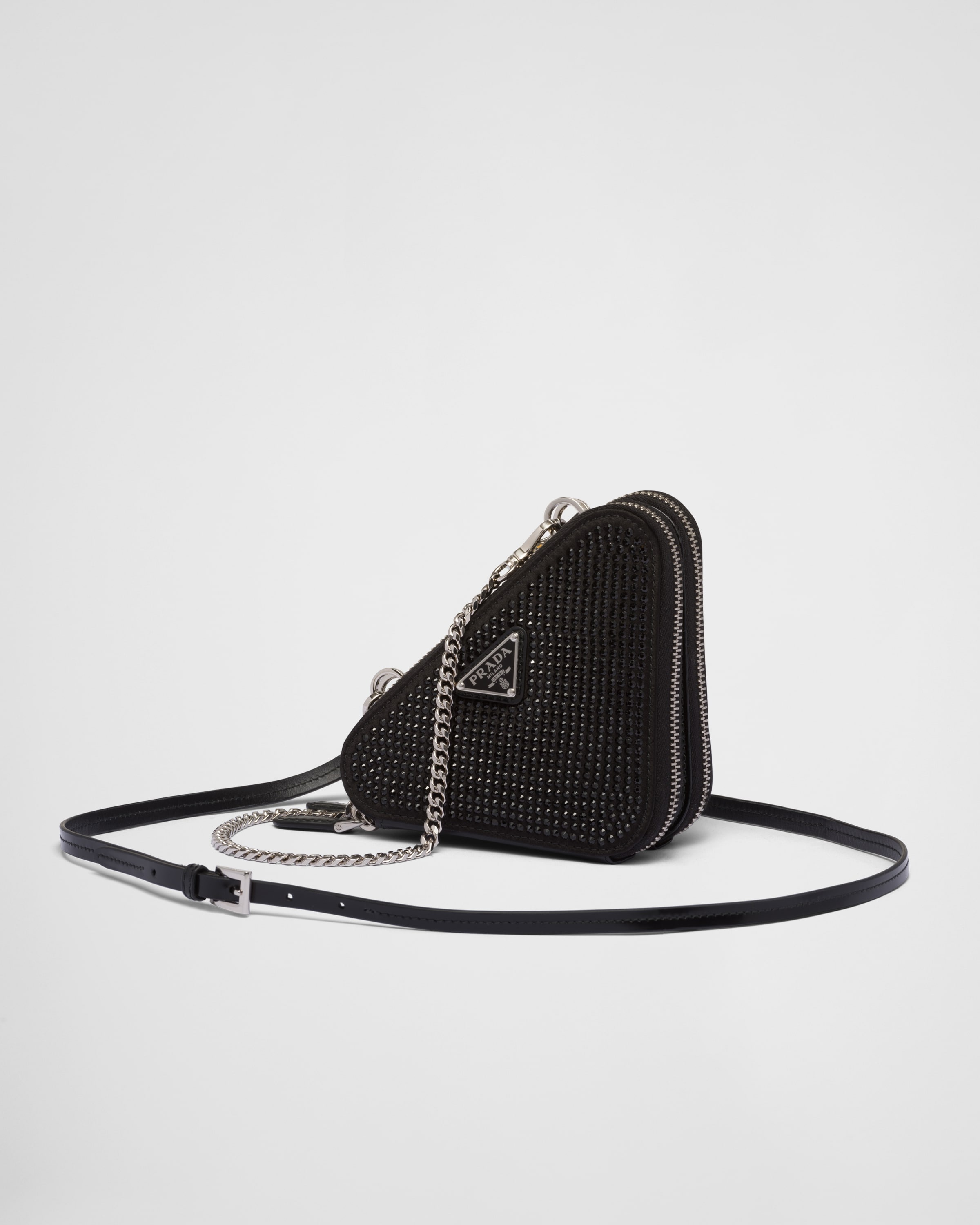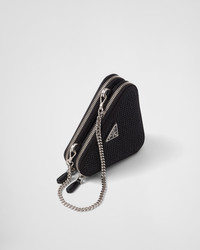 A dazzling design characterizes this triangular mini-pouch embellished with all-over crystals. The detachable chain handle and enameled metal triangle logo complete the accessory. - Product code: 1NR015_2AWL_F0002 - With synthetic crystals - Zipper closure - Enameled metal triangle logo - Detachable adjustable leather shoulder strap - Removable chain handle - Logo-print nylon lining - Imported Height: 10cm Width: 15cm Length: 15cm MATERIALS Fabric/Leather