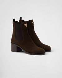 These suede booties have a refined and versatile design with clean lines. The enameled metal triangle logo embellishes the style with its sleek, distinctive signature. - Product code: 1T227N_QRG_F0003_F_055 - Upper with elasticized side gusset and pull tab on the back - Leather lining - Enameled metal triangle logo - Boot leg: 14 cm - Leather and monoblock rubber sole with hot-stamped logo - Heel height: 55 mm - Imported MATERIALS Main material: Lambskin
