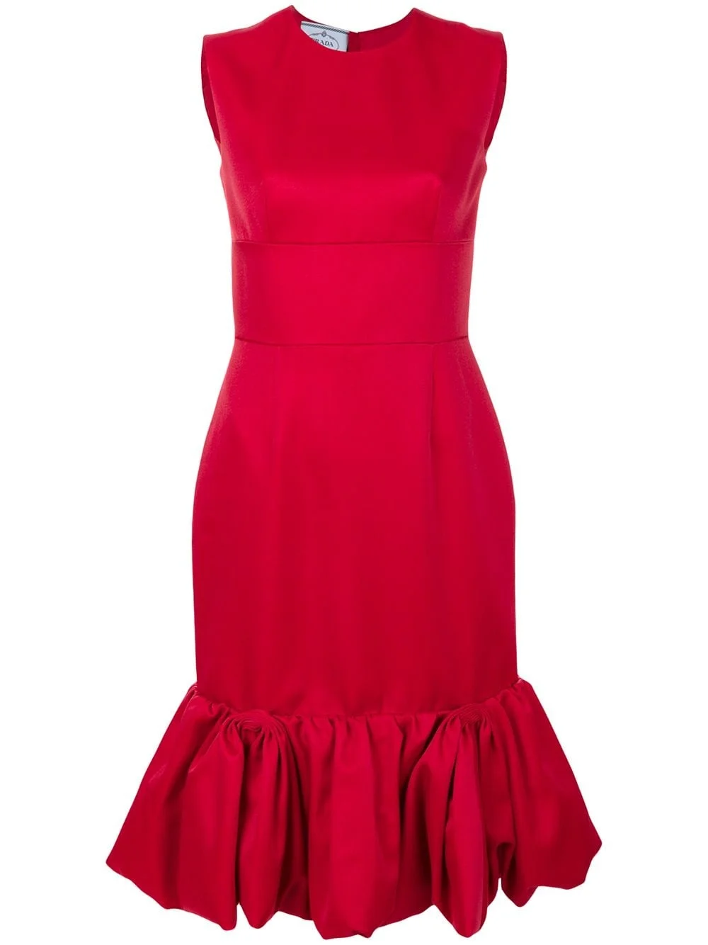 flared dress Highlights - Timeless yet imaginative, iconic italian fashion house prada balances uncompromised quality with experimental, season-defining styles. fashioned in italy from a wool and silk blend in a varnish red colourway, this tulip shape gathered detail dress is a considered party piece with trans-seasonal appeal. it features a round neck, a sleeveless design, a mid-length, a back zip fastening, a cinched waist and ruffled hem with a gathered detailing. Composition Outer: Wool 75%, Silk 25% Lining: Viscose 100% SIZE & FIT Model measurements Height 5 ft 10 in(1.78 m) Bust/Chest 33.07 in(84 cm) Hips 35.82 in(91 cm) Waist 26.96 in(68.5 cm)