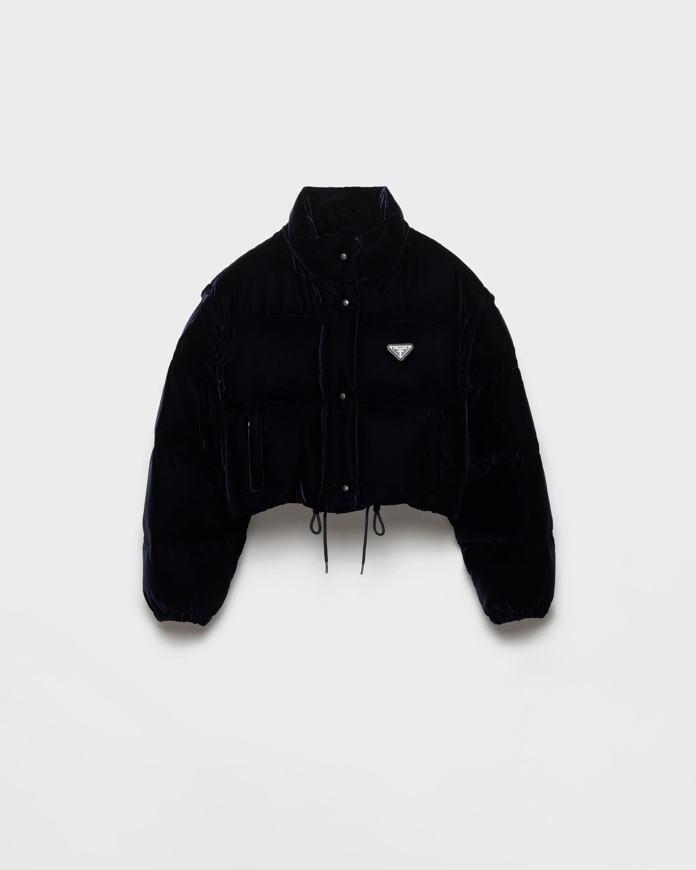 The refined, soft touch of velvet highlights the volumes of this versatile down jacket. Sophisticated notes and sporty details define the garment characterized by detachable sleeves and decorated with the enameled metal triangle logo. - Product code: 291805_18H4_F0008_S_222 - Relaxed fit - The garment fits up to two sizes larger - Goose down padding - Stand-up collar - Detachable sleeves - Elasticized cuffs - Zipper and snap closure - Welt zipper pockets - Drawstring hem - Enameled metal triangle logo - Internal zipper pocket - Re-Nylon lining - Imported Height: 45cm MATERIALS Main material: 19% cupro 9% silk 72% viscose