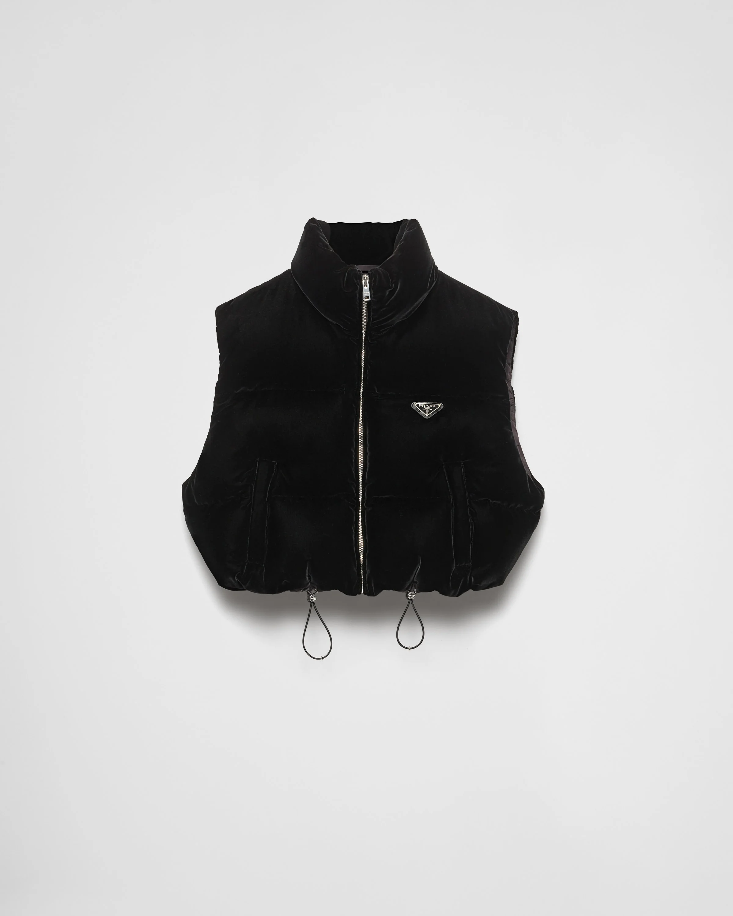 This velvet down vest with soft volumes and a sporty, functional character is decorated with the iconic triangle logo. - Product code: 29X056_16AB_F0002_S_222 - Goose down padding - Stand-up collar - Zipper closure - Welt pockets - Elasticized drawstring hem - Enameled metal triangle logo - Imported - The model is 178 cm tall and wears a size 38 Height: 45cm MATERIALS Main material: 35% cupro 65% viscose