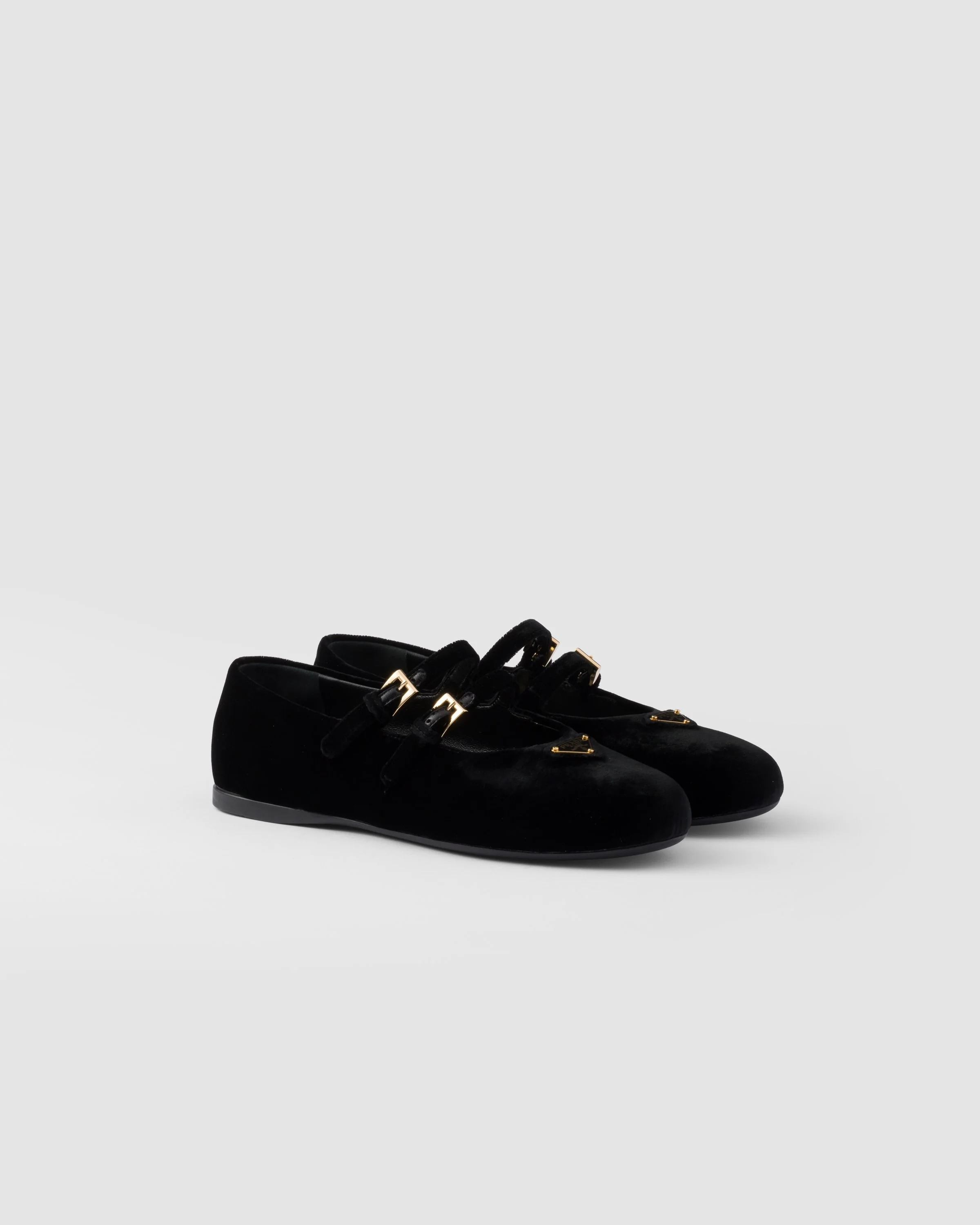 These velvet ballerinas feature an elegant, tapered silhouette with double straps adorned with the iconic enameled metal triangle logo. - Product code: 1F794N_068_F0002_F_005 - Upper with straps and logo-engraved metal buckles - Enameled metal triangle logo - Monoblock rubber sole, 05 mm, with hot-stamped logo - Imported MATERIALS Main material: Cupro viscose