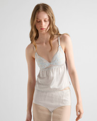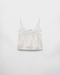 This romantic and sophisticated lingerie-style satin top features lace trim that embellishes the delicate design. - Product code: TP6236_17GT_F0082_S_OOO - Bustier fit - Lined - Back hook closure - Spaghetti straps - Enameled metal triangle logo - Imported - The model is 176 cm tall and wears a size 38 MATERIALS Main material: 100% silk