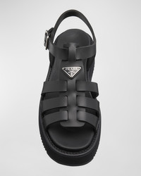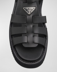 - Prada vinyl fisherman sandals - Signature logo triangle accent - 2.00 in / 50 mm flatform heel - Open toe - Caged vamp - Adjustable ankle strap - Rubber outsole - Professional cleaning recommended, spot clean - Made in Italy Online Inquiries: NMS21_X6LUW Store Inquiries: #4807240