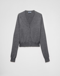 This light wool cardigan reinterprets a classic menswear style with a sleek silhouette. The tonal triangle logo completes the garment with a distinctive note. - Product code: P25N50_16SW_F0480_S_OOO - Long sleeves - Plain knit - Boxy fit - Ribbed knit neck - Semi-raglan shoulder - Ribbed knit cuffs and hem - Triangle logo - Front button closure - Imported - The model is 178 cm tall and wears a size 38 Height: 48cm MATERIALS Main material: 100% virgin wool