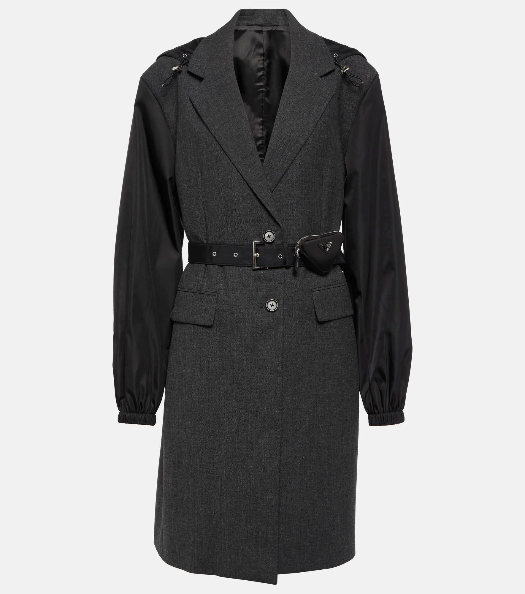 Prada takes Italian heritage into a distinctly modern direction with a streamlined and fashion-forward approach. Made from virgin wool with contrasting sleeves and hood, this contemporary coat has an oversized fit and a detachable waist-cinching belt. Product Details - Material: 100% virgin wool - Care instructions: dry clean - Made in Italy - Designer color name: Ardesia - Material II: 100% polyamide (recycled) - Material III: 100% polyamide (recycled) - Lining: 100% cupro - Contains non-textile parts of animal origin - Pockets: flap pockets, internal pockets - Closure: buttoned front - Drawstring hood - Detachable belt - Item number: P00842610 Size & Fit - Fits large to size - we recommend trying one size smaller - Shoulder pad inserts - Loose fit, comes with belt - The model seen in the picture is 178cm-5'10" and wearing a size IT 38