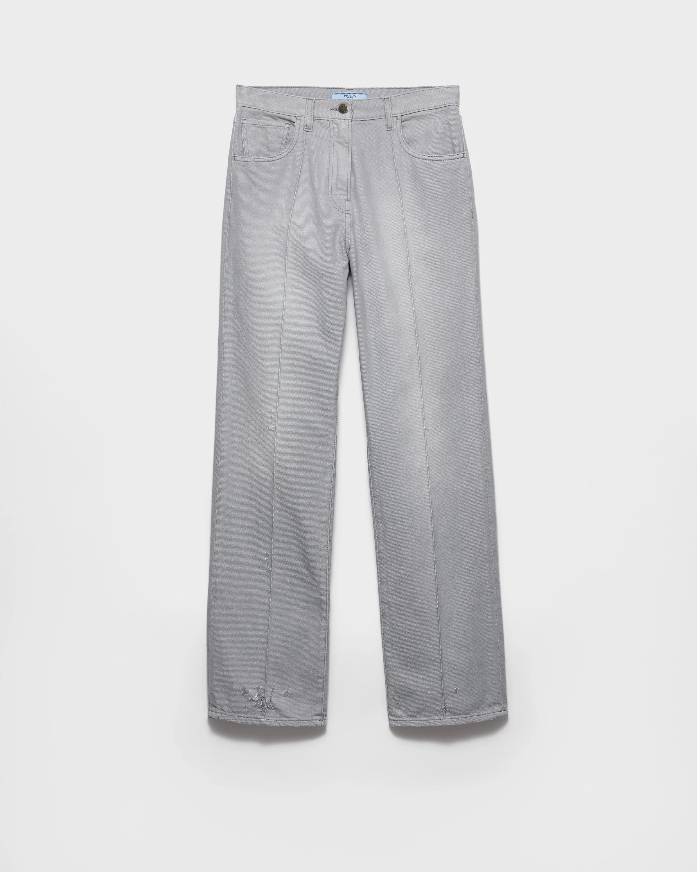 These jeans with a straight, low-rise fit are a versatile, contemporary piece. The washed treatment adds depth to the denim and a distinctive character to the style decorated with an archive logo printed on the label. - Product code: GFP545_18NF_F01AY_S_OOO - Washed treatment - Garment dyed - Straight fit - Low-rise waist - Hen width: 23 cm, size. 25 - Zipper fly - Rounded front pockets with coin pocket - Back patch pockets - Total length 108 cm, Size: 25 - Prada Milano logo label on the back - Imported - The model is 177 cm tall and wears a size 38 Height: 103cm MATERIALS Cotton