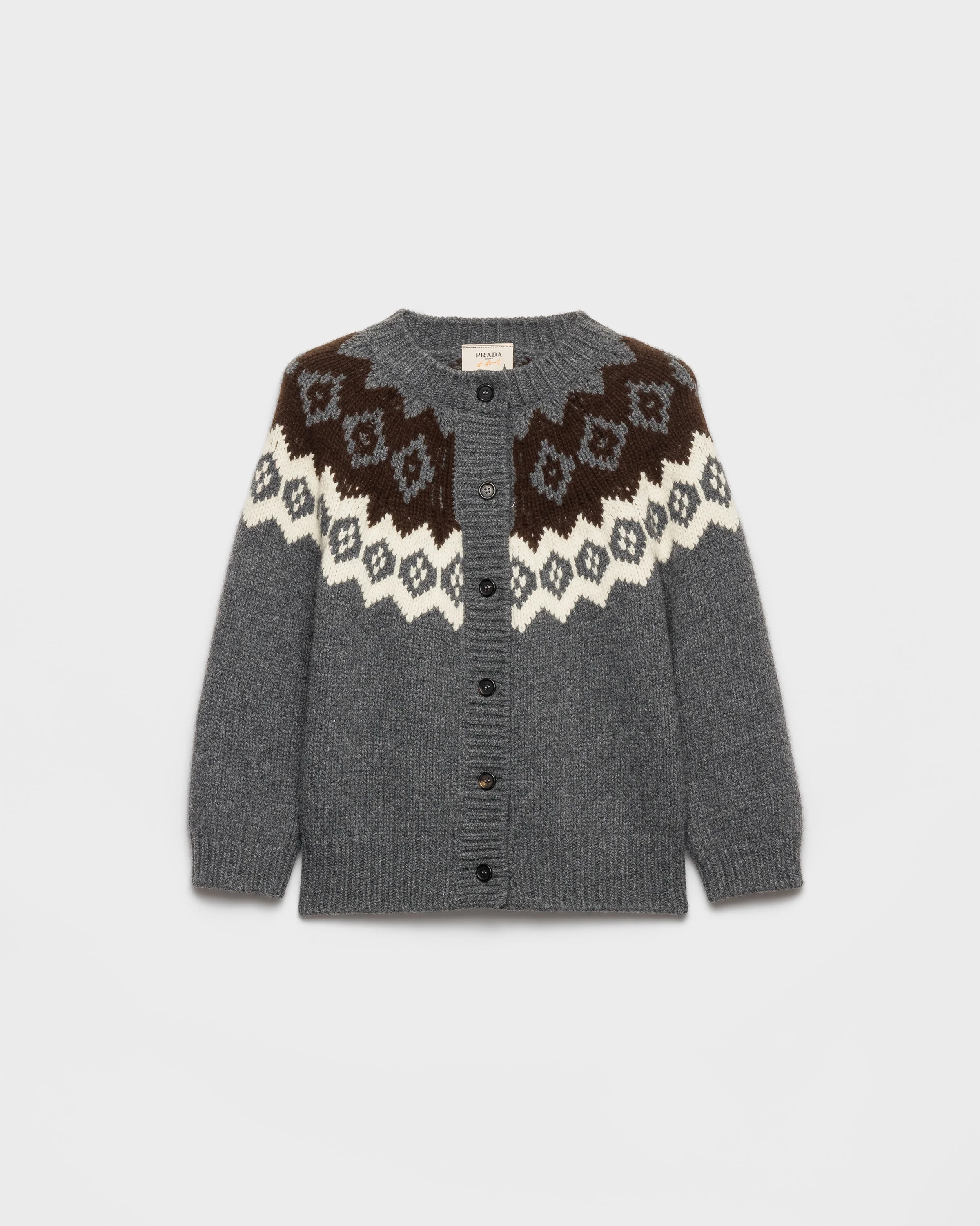 This cardigan made with a premium blend of wool and cashmere reinterprets the apres-ski style with a contemporary design combining comfort and sophistication. The boxy silhouette with three-quarter sleeves is enriched by the intarsia knit that recalls a classic winter motif. - Product code: P25O13_18VZ_F0BMU_S_OOO - Three-quarter sleeves - Intarsia knit - Boxy fit - Ribbed knit crew neck - Raglan shoulder - Ribbed knit cuffs and hem - Embroidered logo - Front button closure - Imported - The model is 180 cm tall and wears a size 38 Height: 56cm MATERIALS Main material: 30% cashmere 70% virgin wool