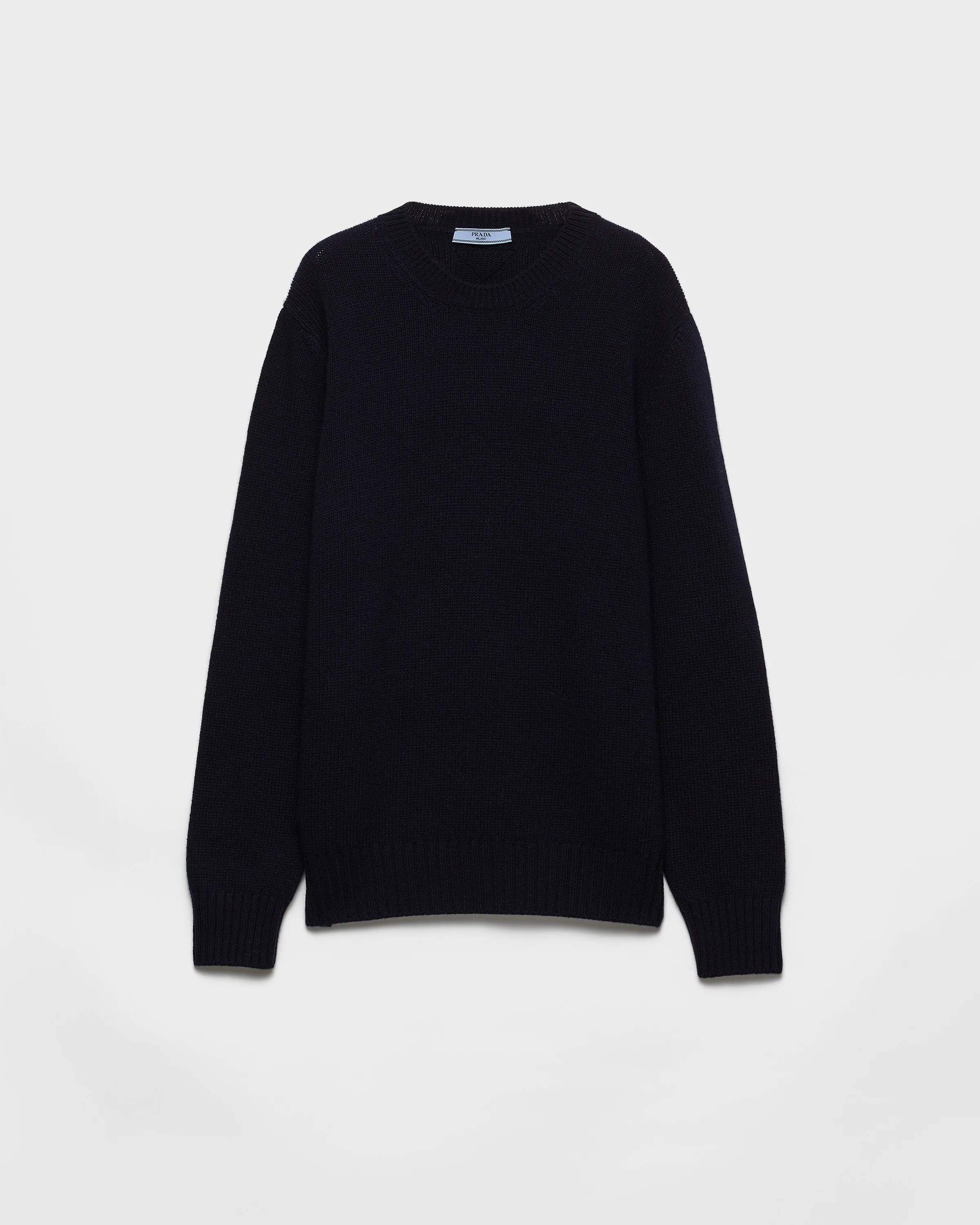 Clean lines with a minimalist cut reinterpret the sleek design of this long-sleeved sweater made of warm wool and cashmere. A wardrobe classic is reinterpreted according to a contemporary language and transformed into a garment featured in unexpected combinations. The soft, relaxed menswear-inspired silhouette is embellished with the triangle logo on the back that completes the garment with an iconic touch. - Product code: P24A3Z_13XA_F0008_S_232 - Long sleeves - Plain knit - Menswear fit - Ribbed knit crew neck - Regular shoulder - Ribbed knit cuffs and hem - Triangle logo - Imported - The model is 180 cm tall and wears a size 38 Height: 64cm MATERIALS Main material: 30% cashmere 70% virgin wool