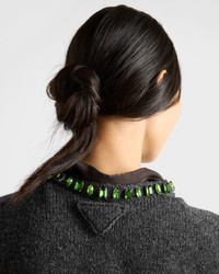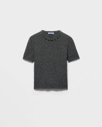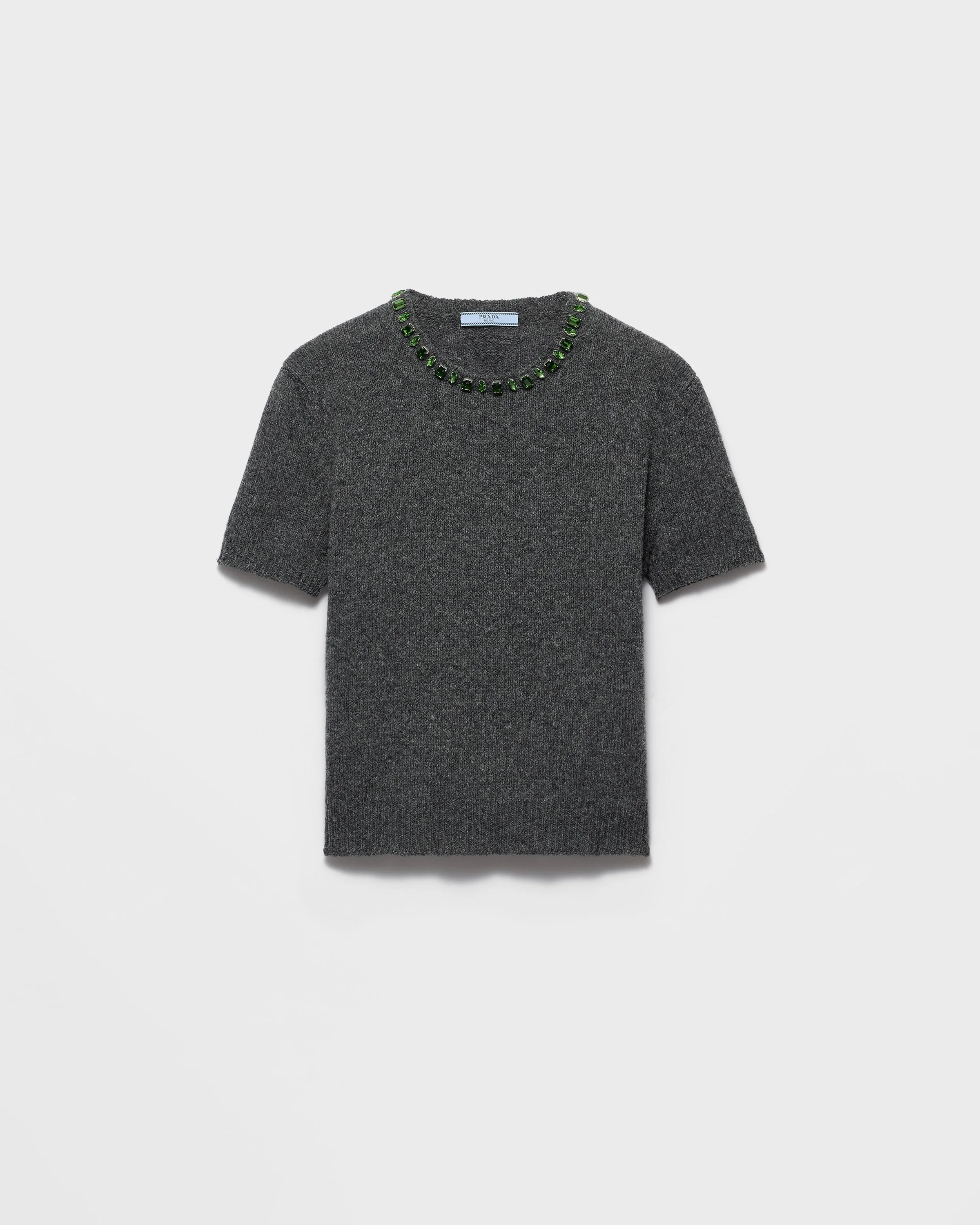 Jewel details brighten this short-sleeved sweater characterized by an unexpected combination of lines and materials. The style is made with a wool and cashmere yarn that gives the silhouette softness and structure and is completed by a crystal embellishment on the crew neck. - Product code: P24V2B_18M6_F0308_S_OOO - Short sleeves - Plain knit - Menswear fit - Ribbed knit neck with appliqued jewel embellishment - Semi-raglan shoulder - Ribbed knit sleeve trim - Triangle logo - Imported - The model is 178 cm tall and wears a size 38 Height: 54cm MATERIALS Main material: 30% cashmere 70% virgin wool